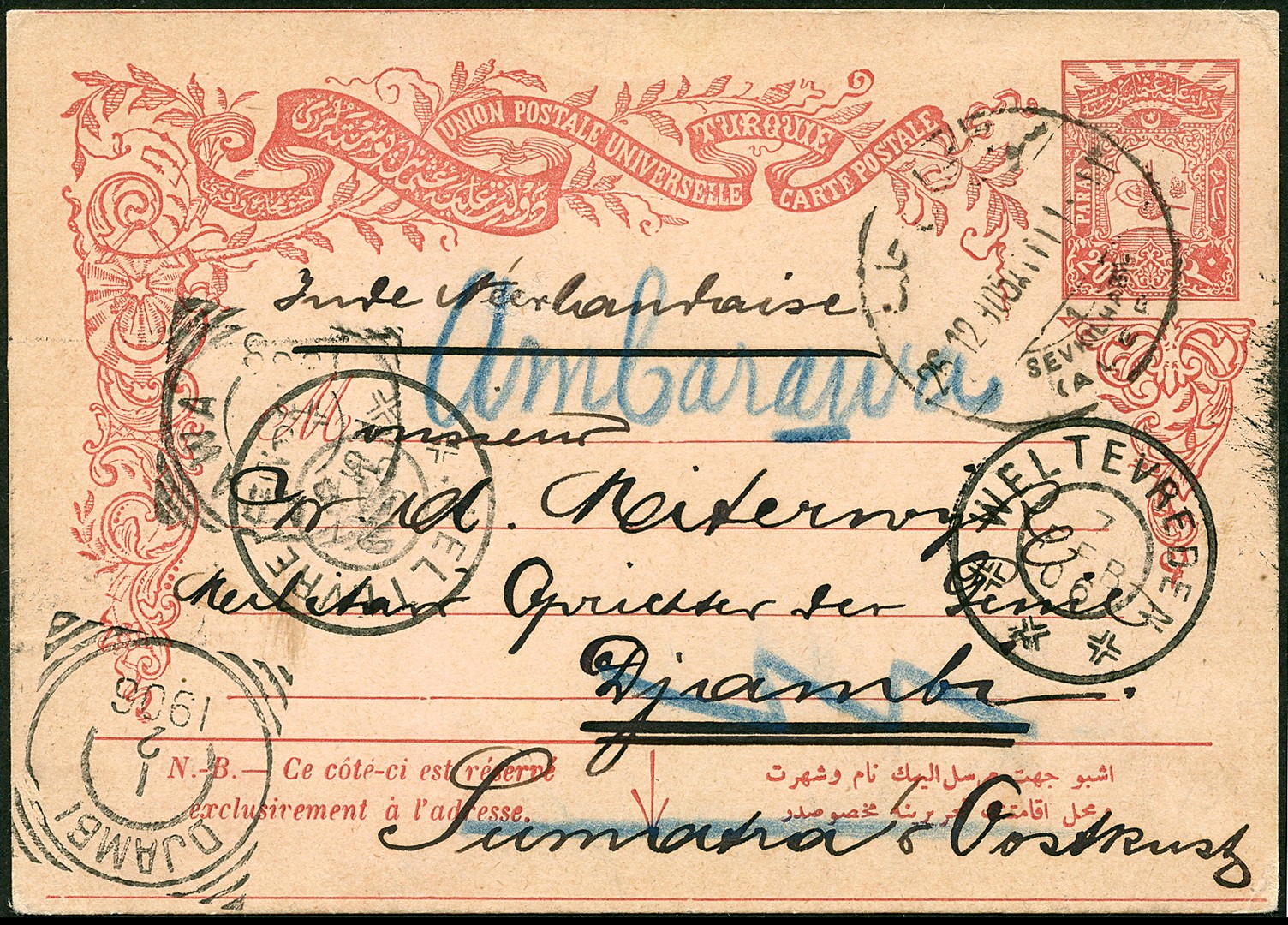 TURKIJE. Bk. van 20p van Sevkilhabil (Aleppo) 26-12-1905 via Weltevreden 21-1-1906 naar een militair te Djambi 1-2, doorgez. via Weltevreden naar Ambarawa 9-2