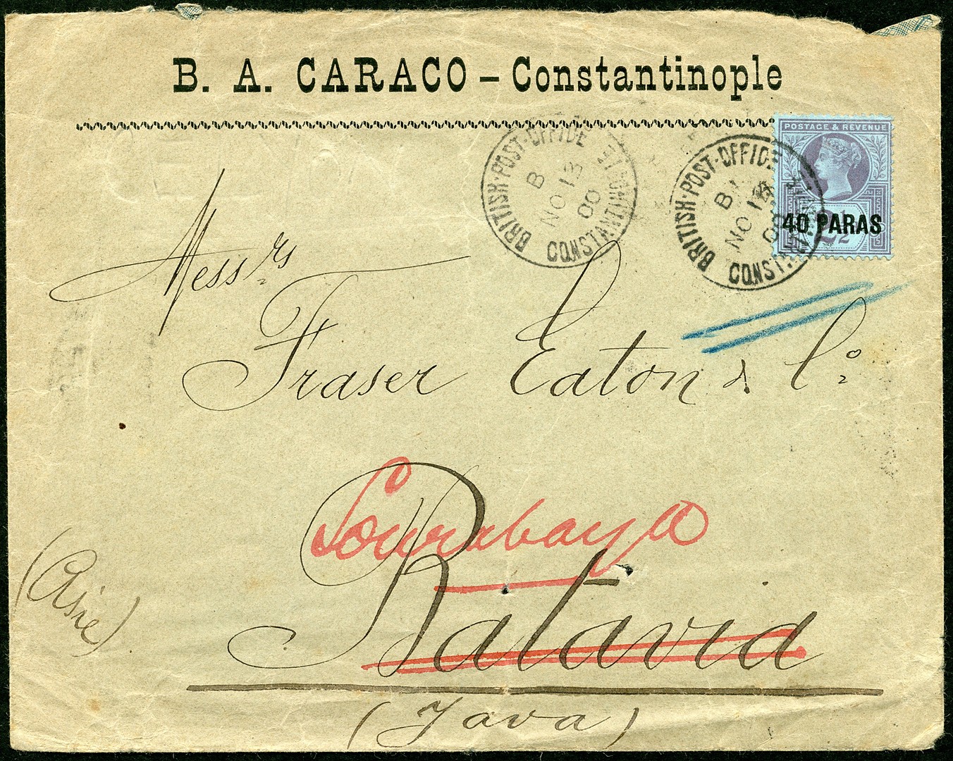 TURKIJE. BRITSE LEVANT. Env. (gebruikssporen) gefr. met 40pa op 2½d van het Britse postkantoor in Constantinopel 13-11-1900 via Alexandrie 17-11, Suez, Colombo, de N.I.Agent Singapore 5-12 over Weltevreden naar Batavia, daar op 9-12 doorgez. naar Soerabaja 12-12. Interessante herkomst