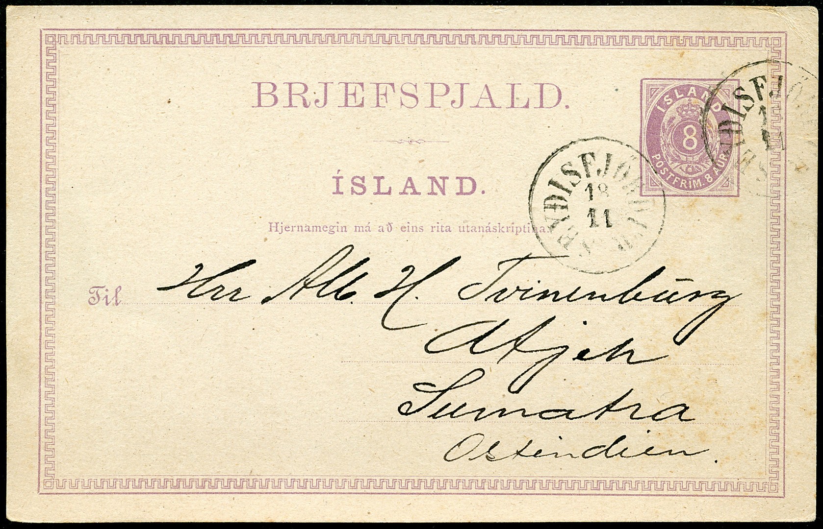 IJSLAND. Bk. van 8a (rechts miniem getint) van Seydisfjördur 18-11(-1893) naar Atjeh (zeldzame herkomst!), alsmede wat getinte bk. van 10a van Reykjavik 17-11-1904 naar Makasser (kaart beantw. op 1-4-1905)
