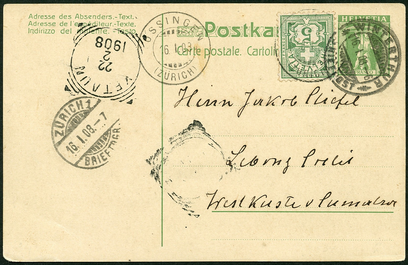 ZWITSERLAND. Vijf briefkaarten 1894-1908 o.a. naar Lebong Soelit via Ketaun 22-2-1908