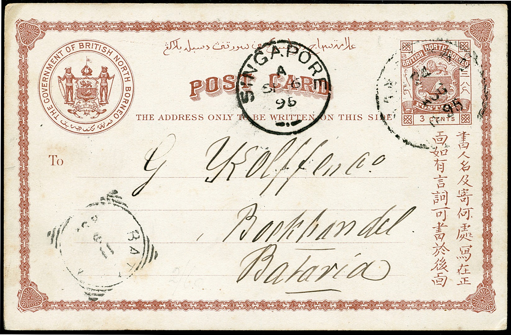 BRITS NOORD-BORNEO. Bk. van 3c geschreven op 3-7-1895 van Sandakan 24-8 over Singapore 6-9 naar Batavia 11-9