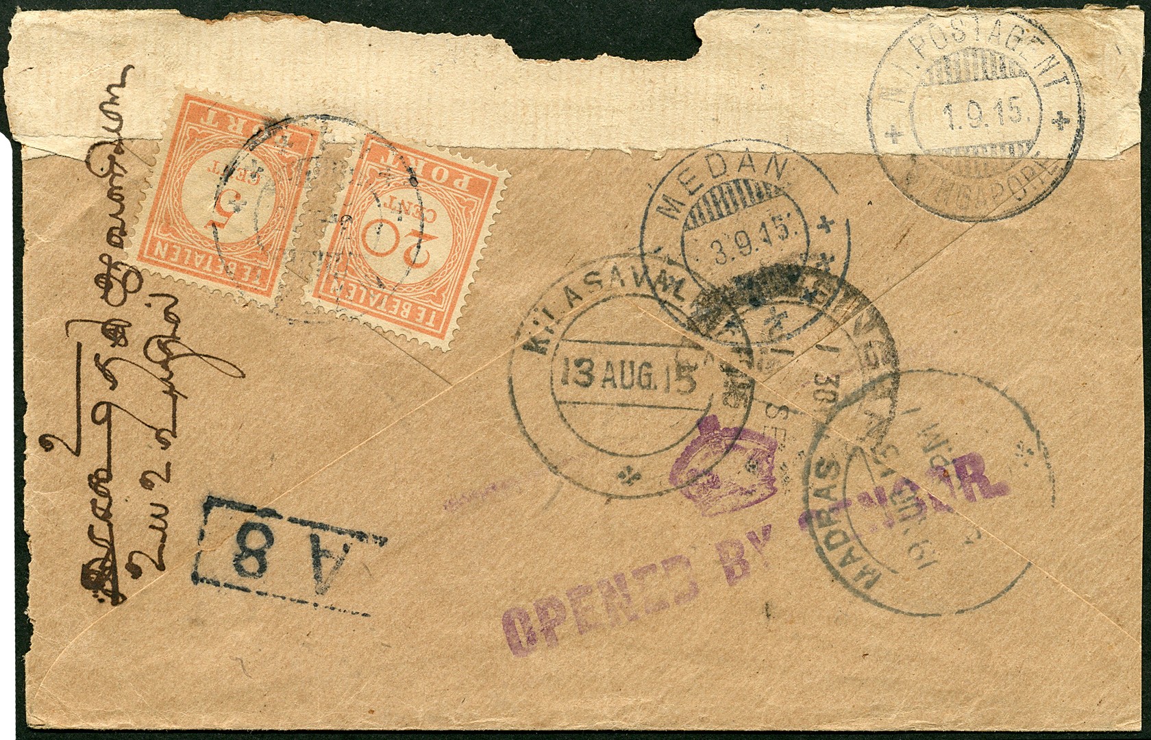 INDIA. Twee iets minder zorgvuldig geopende, beporte enveloppen. Ongefr. gecensureerde env. uit Kilasaval 13-8-1915 o.a. via de N.I.Postagent / Singapore (KB) naar Medan en daar met 25 cent beport, alsmede env. gefr. met ½a in strip van vier uit Madras 16-6-1917 in Medan met 5 cent beport