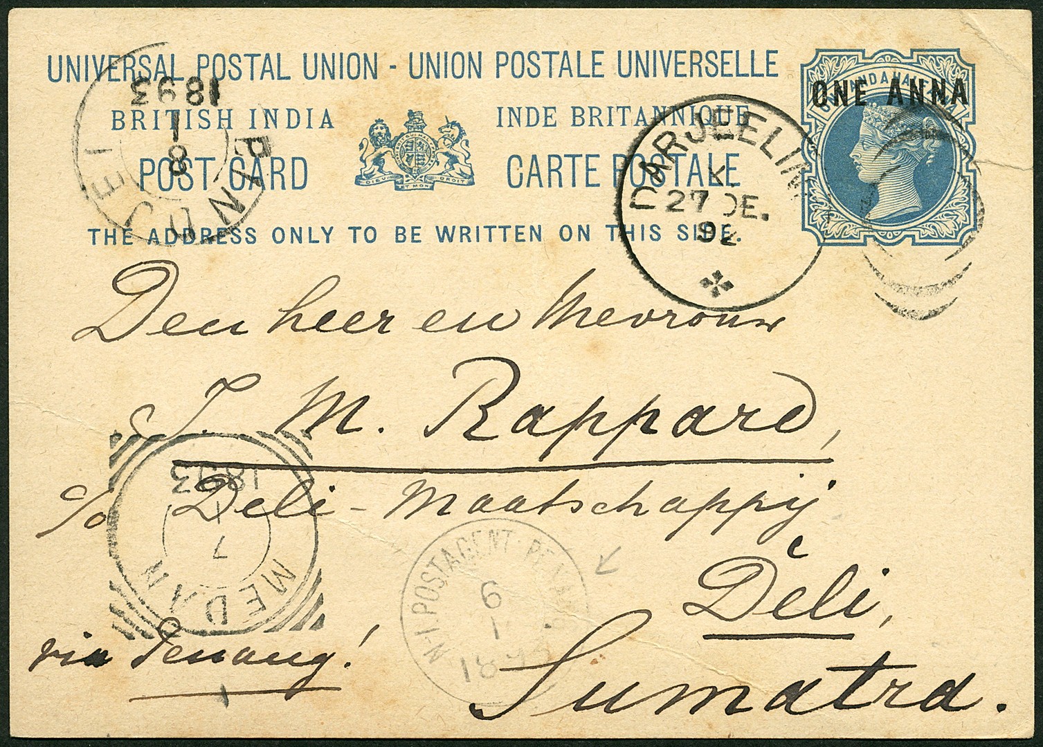 INDIA. Twee env. (Shoolay, 1907 en Calcutta, 1916) en zeven bk. uit Aden (1896, 1897), Calcutta (1911), Darjeeling (1893), Karachi City (1898), Rangoon (1897) en Vizagapatam (1897)