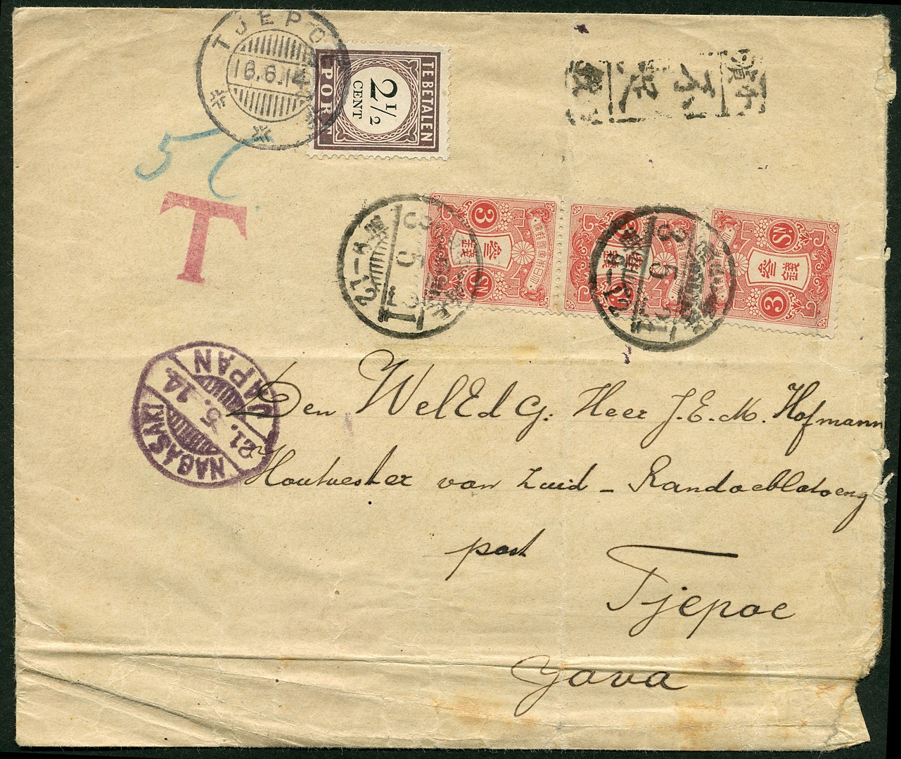 JAPAN. Wat smoezelige en gevouwen env. ontoereikend gefr. met 3 ex. van 3s van Nagasaki 21-5-1914 over de N.I.Postagent / Singapore 8-6 (kortebalk) en Weltevreden 12-6 naar Tjepoe waar de brief op 16-6 met 2½c port werd belast (zegel van kleur verschoten)