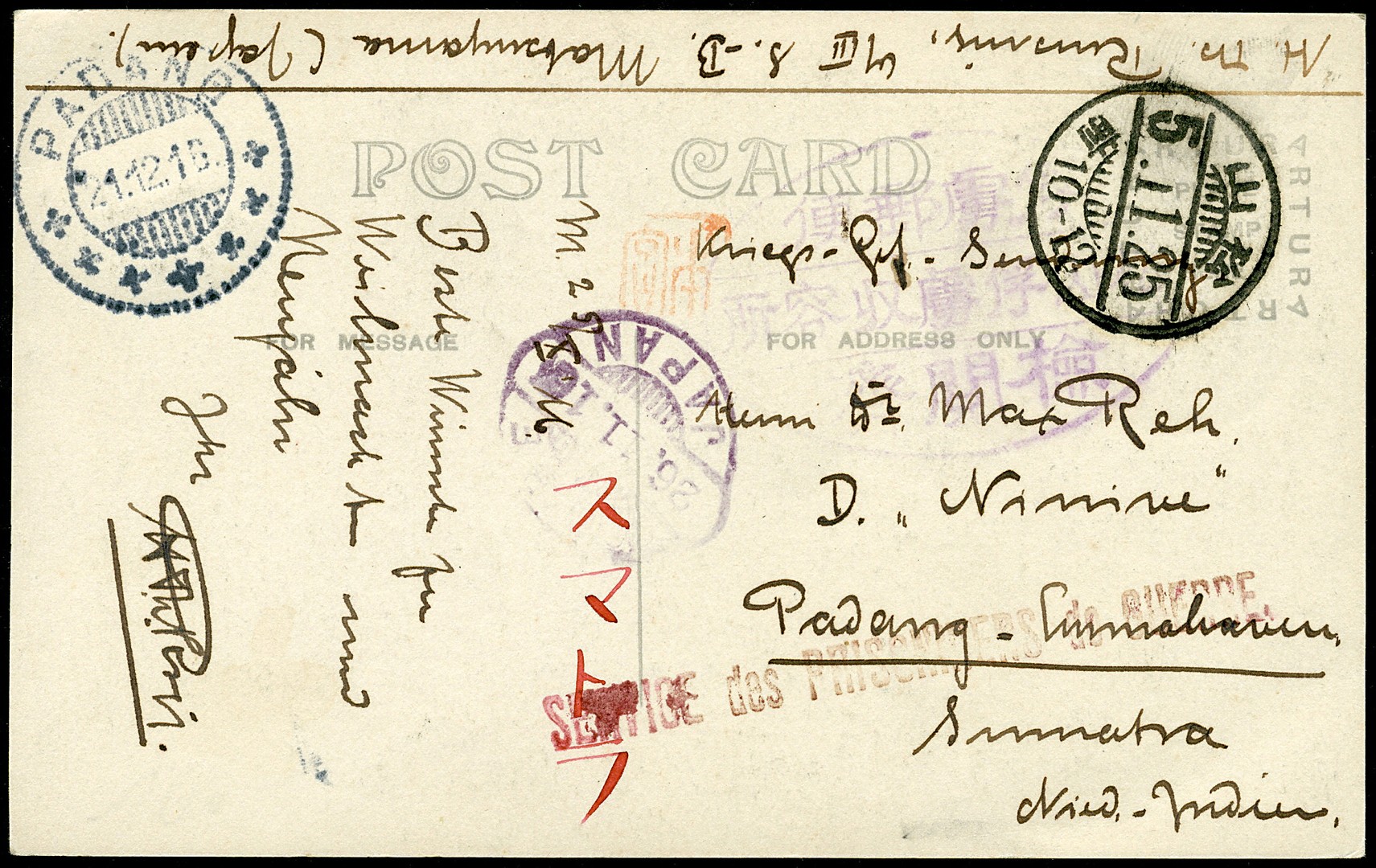 JAPAN. Curieuze fotoprentbk. portvrij verz. door een Duitse krijgsgevangene in het Matsuyama-kamp naar Padang 21-12-1916, met censuurstempel in violet en o.a. 'Service des Prisonniers de Guerre.' in rood. Historisch interessant