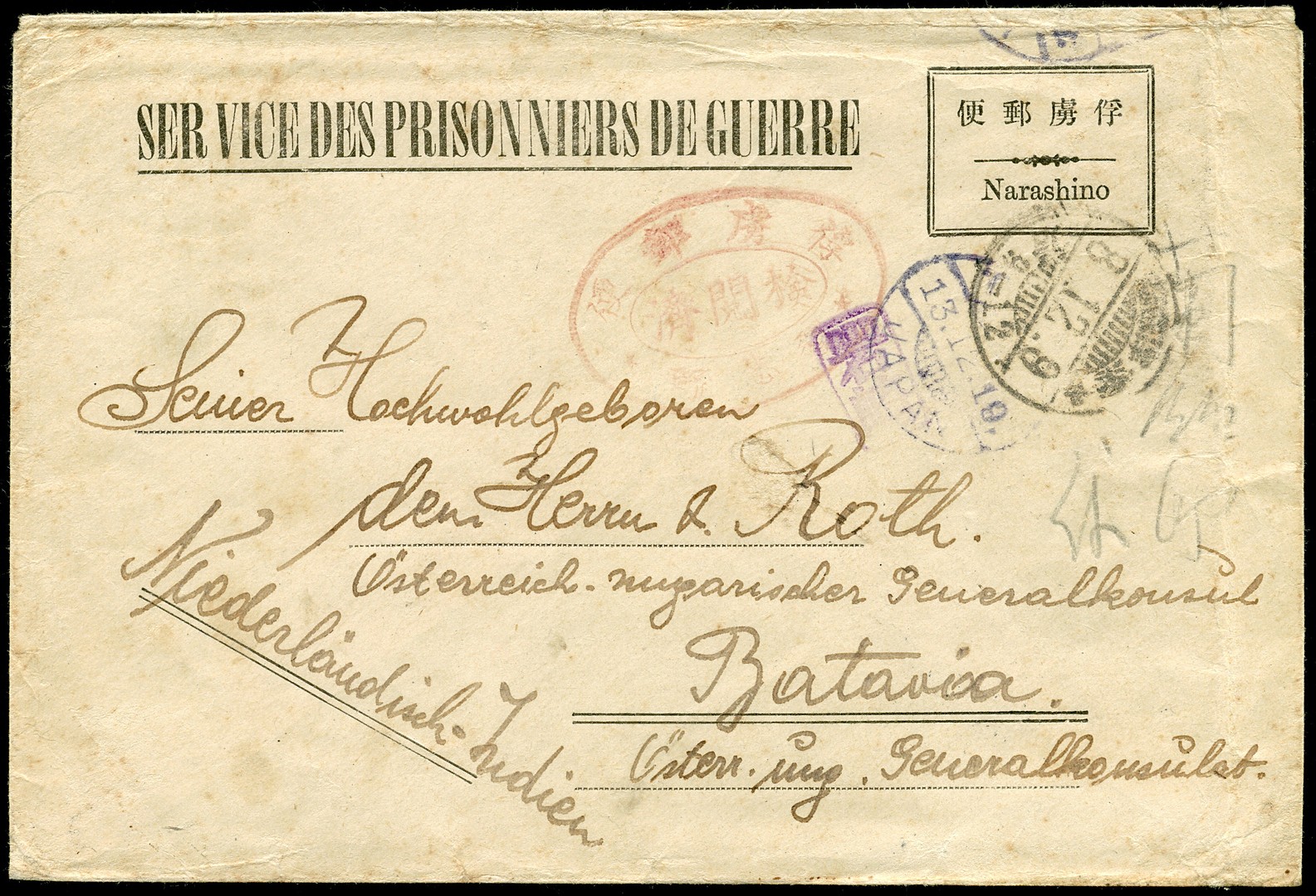 JAPAN. Envelop voor krijgsgevangenen in het kamp Narashino door een Duitse krijgsgevangene naar de Oostenrijks-Hongaarse consul te Batavia, via de N.I.Postagent / Singapore 29-12-1919 (langebalk). Historisch interessant