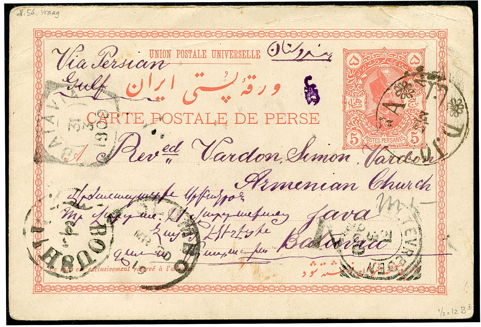 PERZIË. Bk. van 5ch van Djoulfa 12-2-1900 via Boushir 3-3 'Via Persian Gulf' over Colombo 30-3 en Weltevreden 31-3 naar de eerwaarde Vardon Simon van de Armeense kerk te Batavia 31-3