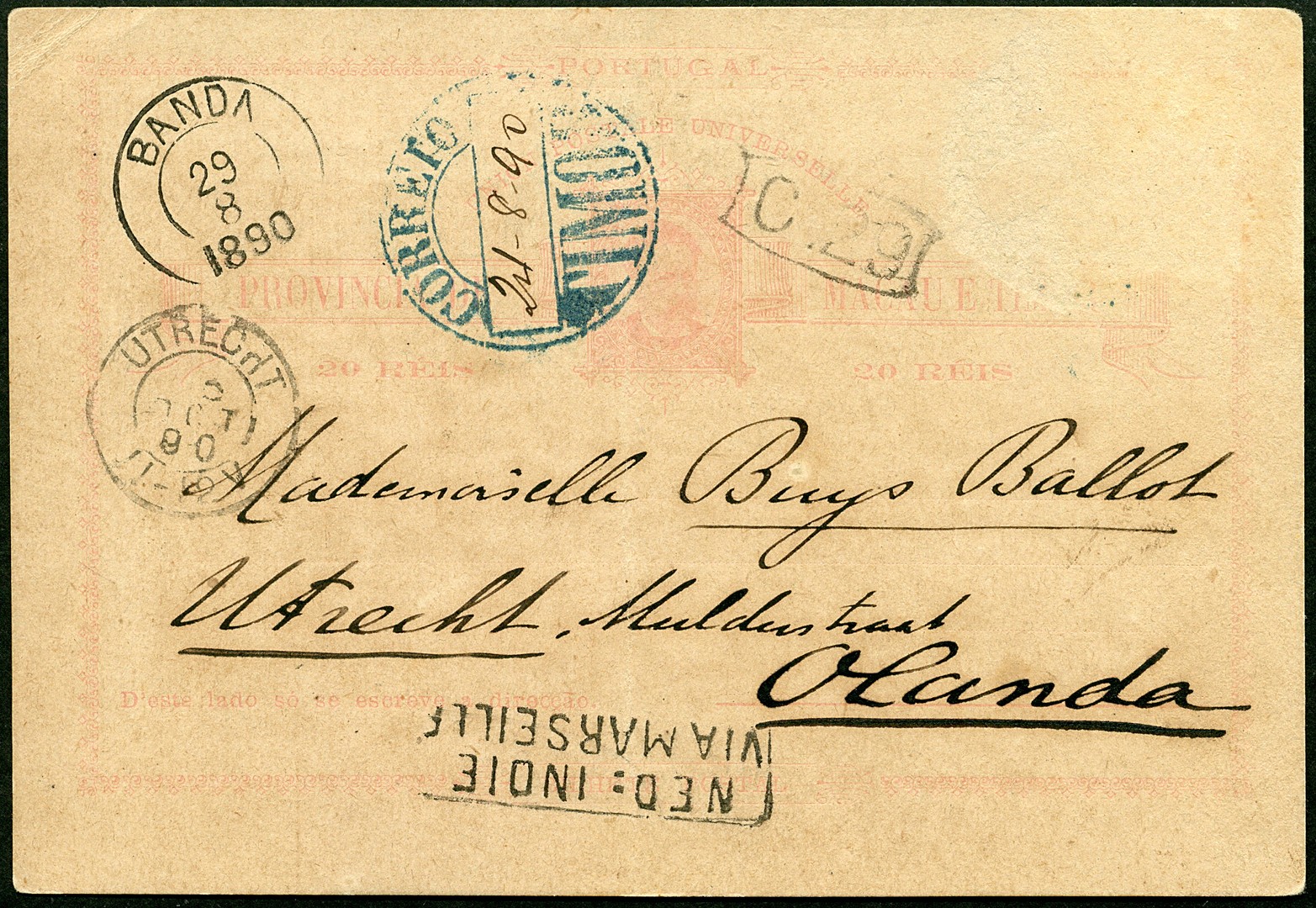 PORTUGEES TIMOR. Bk. van 20r (vert. vouw en zegel verwijderd) van Dilly met blauwe afst. waarin geschreven datum '24-8-90' over Banda 29-8 via Marseille naar Mademoiselle Buys Ballot te Utrecht 5?-10