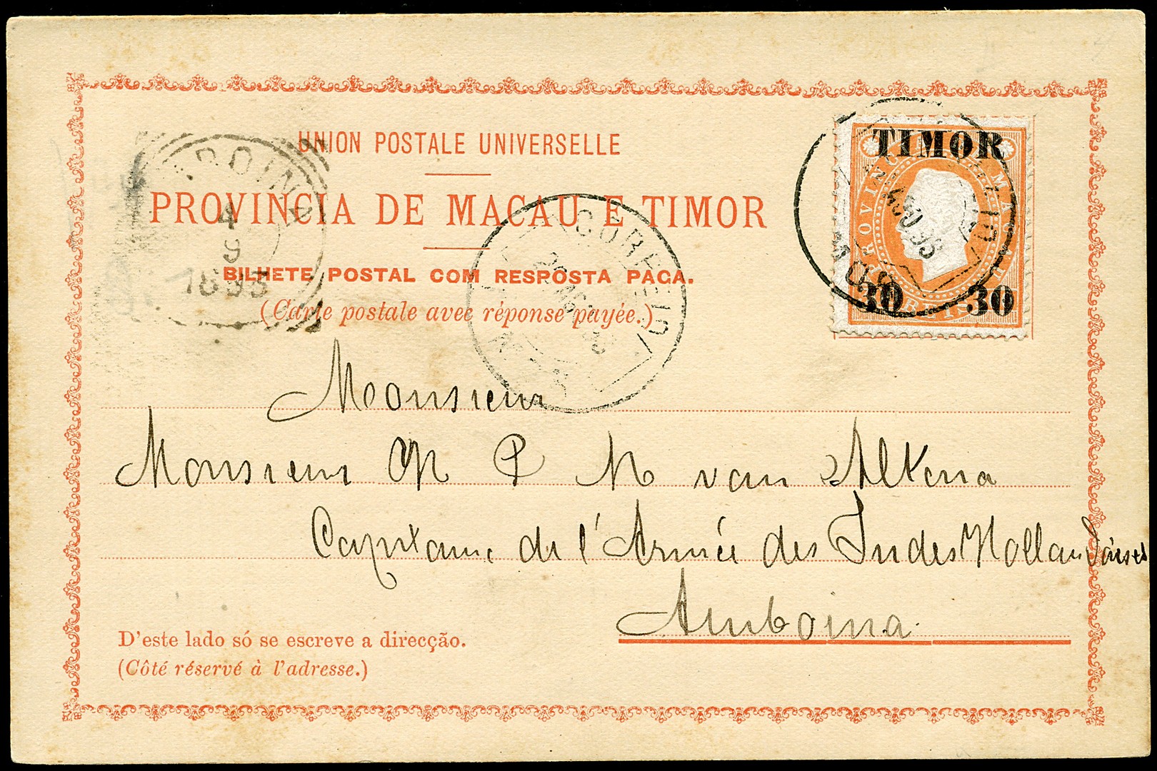 PORTUGEES TIMOR. Bk. (onbeschreven) van 10r van Dilly 26-8-1893(?) naar Koepang, alsmede dubbele bk. gefr. met 30r (onbeschreven) van Dilly 26-8-1893 naar dezelfde kapitein te Amboina 4-9