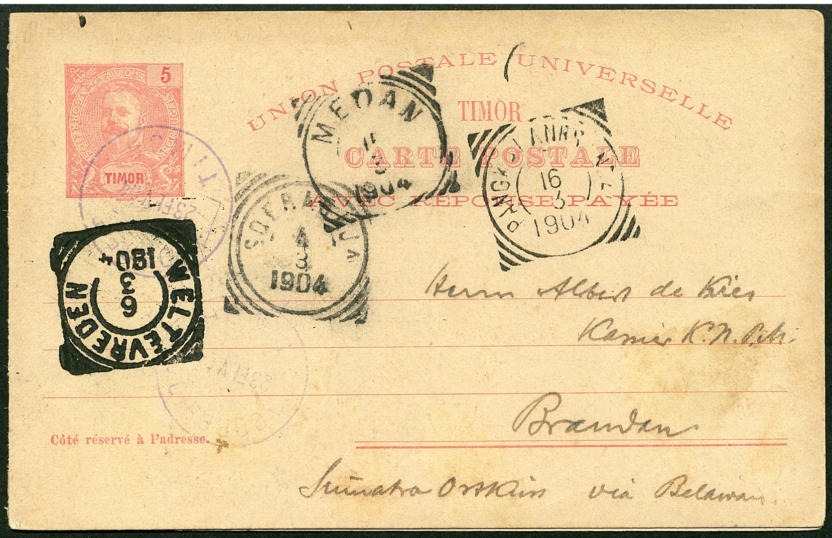 PORTUGEES TIMOR. Dubbele bk. van 5r (A-kaart onbeschreven) van Dilly 23-2-1904 over Soerabaja 4-3, Weltevreden 6-3 en Medan 15-3 naar Pangkalanbrandan 16-3