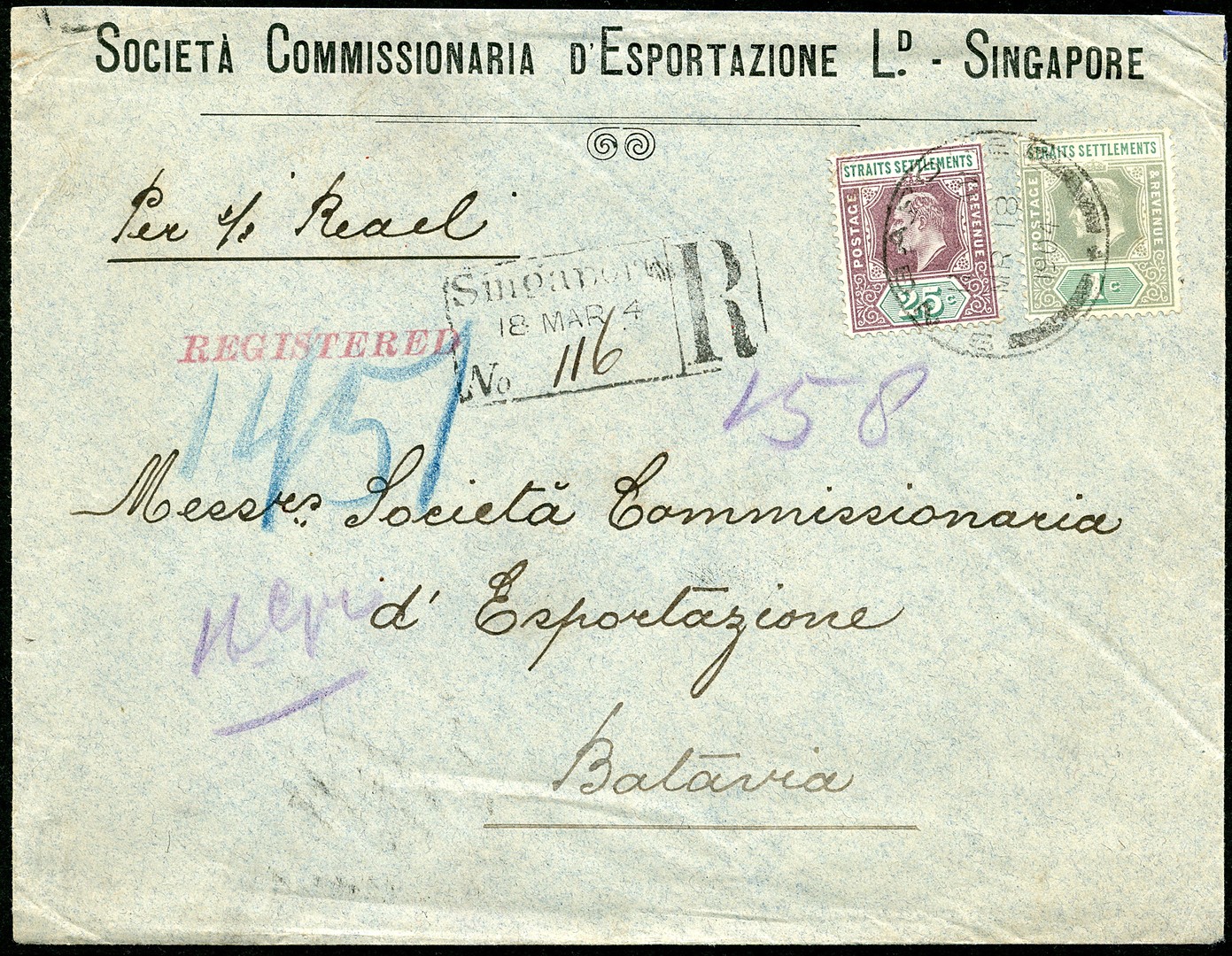 STRAITS SETTLEMENTS. Firmacouvert gefr. met 1c en 25c van Singapore 18-3-1904 aangetekend per s.s. 'Reael' naar Batavia 21-3