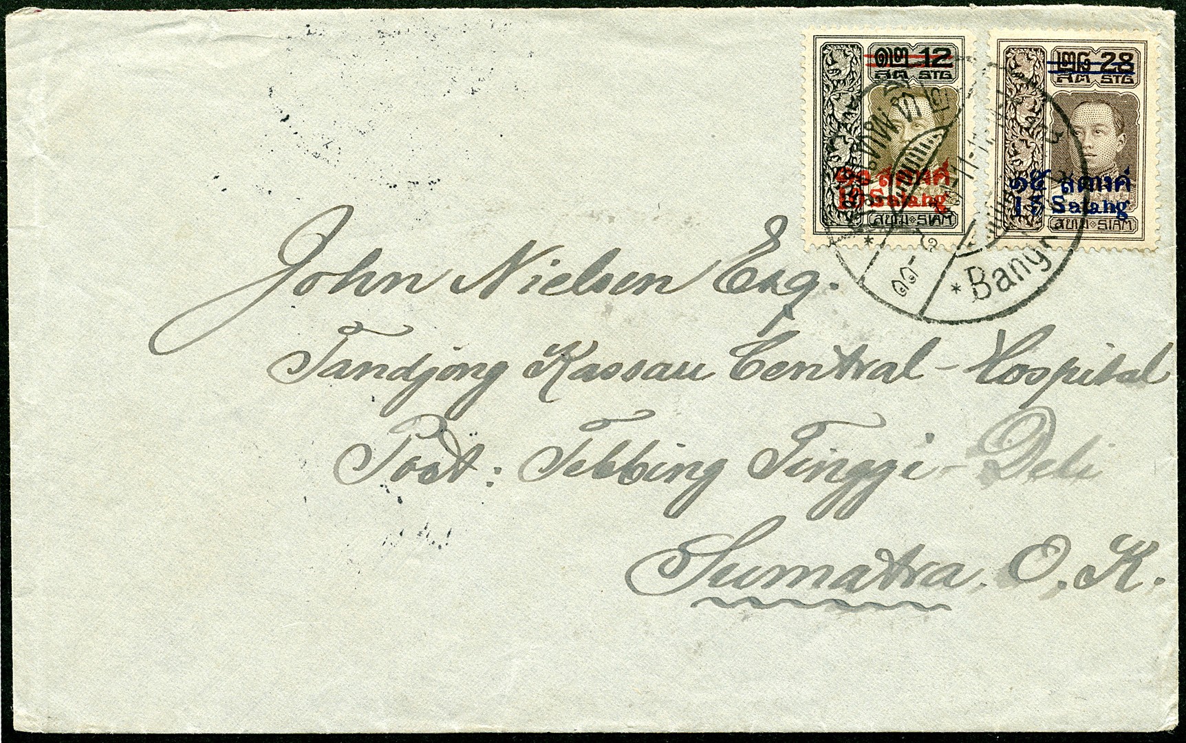 SIAM. Env. gefr. met 10s op 12s en 15s op 28s (Mi.114-115) van Bangkok 11-11-1914 over Singapore 18-11, de N.I.Postagent / Singapore 18-11 (kortebalk) en Medan 22-11 naar Tebingtinggi-Deli 23-11. Aantrekkelijk poststuk met op az. mooie afst.