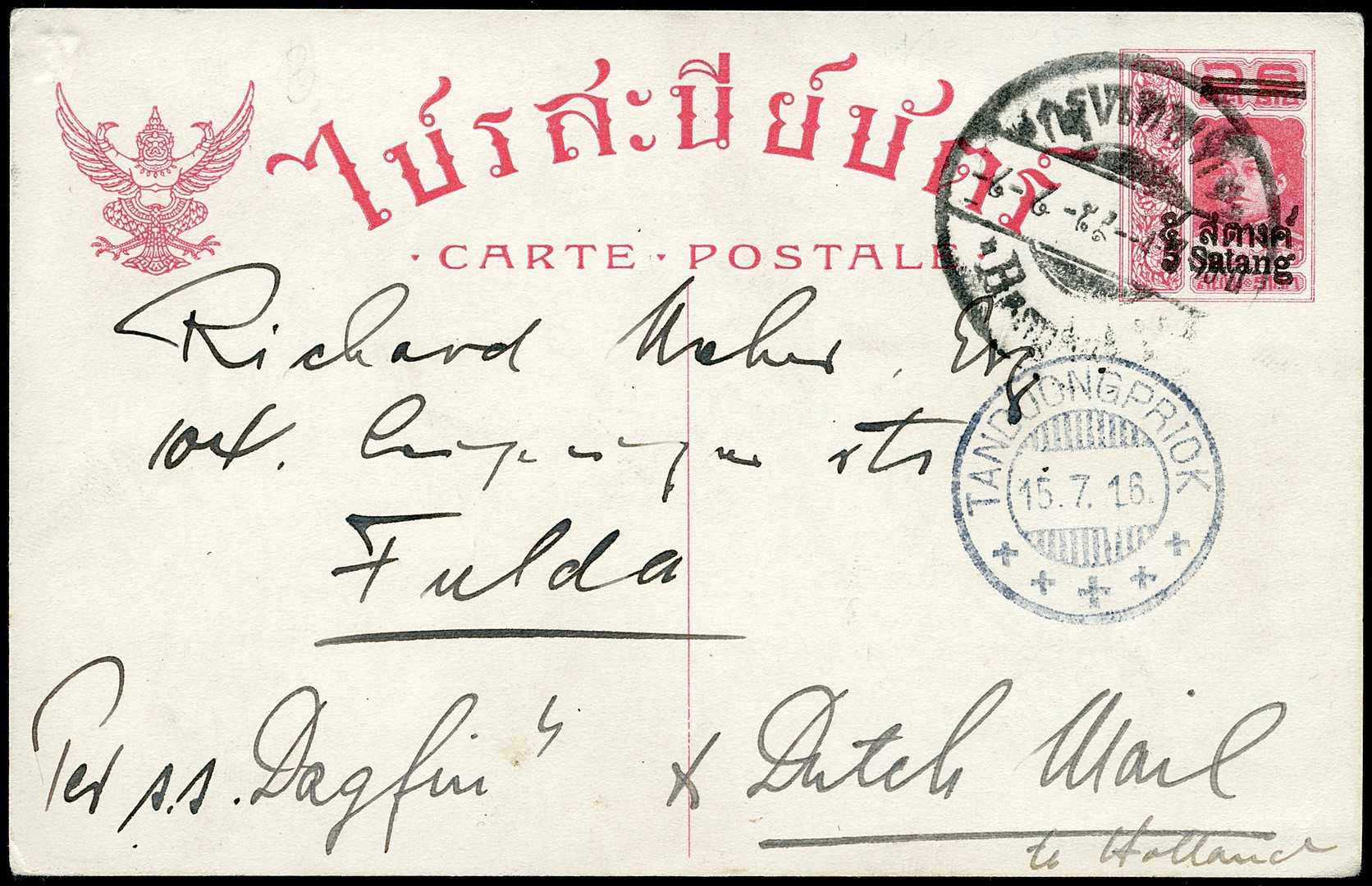 SIAM. Bk. van 5s op 6s van Bangkok 4-7-1916 'Per s.s. Dagfin' (Noors vrachtschip) over Tandjongpriok 15-7 met de Nederlandse mail naar Fulda, Duitsland. Interessant: Duitse correspondentie tijdens Eerste Wereldoorlog via Ned.- Indië!