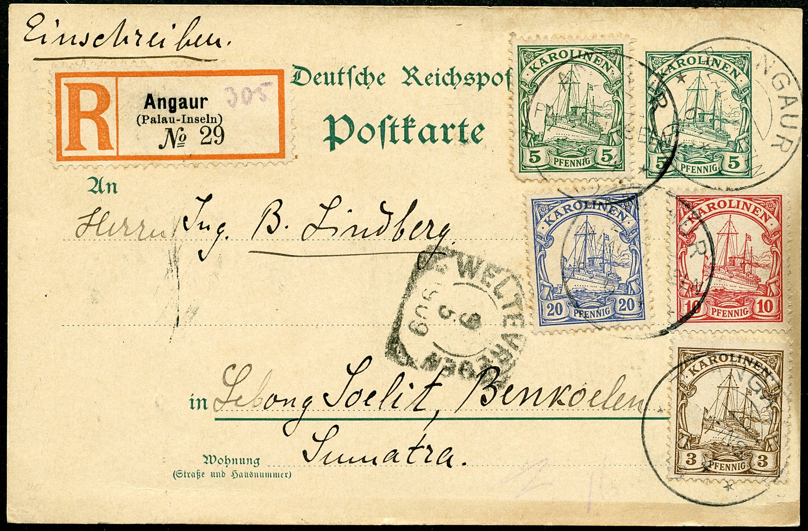 DUITSE KOLONIËN. KAROLINEN. Bk. van 5pf bijgefr. met 3pf, 5pf (mist hoektand), 10pf en 20pf aangetekend van Angaur (Palau Inseln) 6-4-1909 over Hong Kong 1-5 en Weltevreden 9-5 naar Lebong Soelit. Zeldzaam!