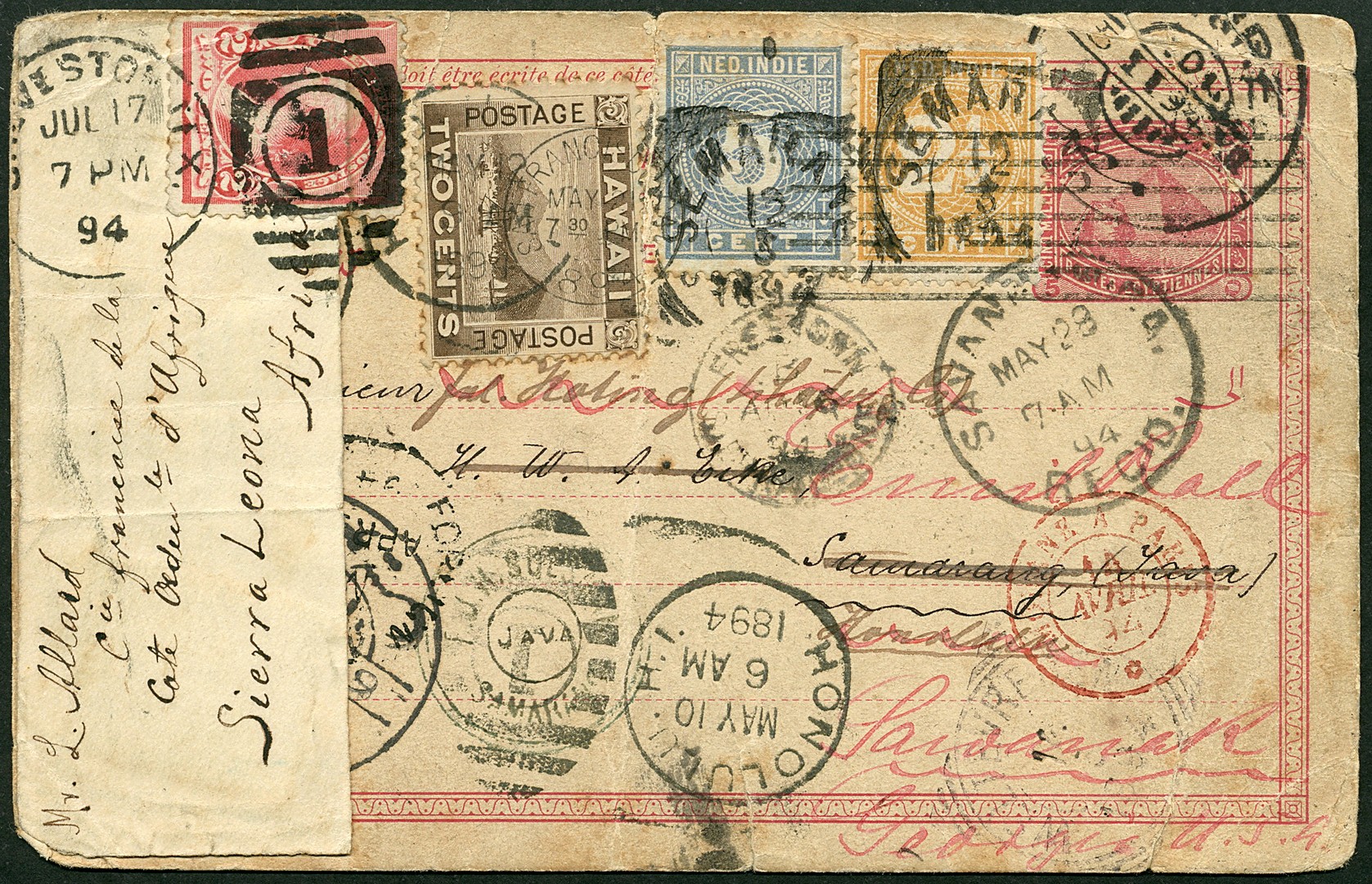 HAWAII. Bk. oorspronkelijk uit Cairo, Egypte, 5-2-1894 die een wereldreis maakt en o.a. de volgende landen/gebieden aandoet: Nederlands-Indië, Frankrijk, Hawaii, Sierra Leone, USA. De kaart heeft uiteraard flinke gebruikssporen (o.a. vouw, scheurtje op vouw), en is in bezit geweest van de fameuze verzamelaar F.J.M. Soesman in Semarang