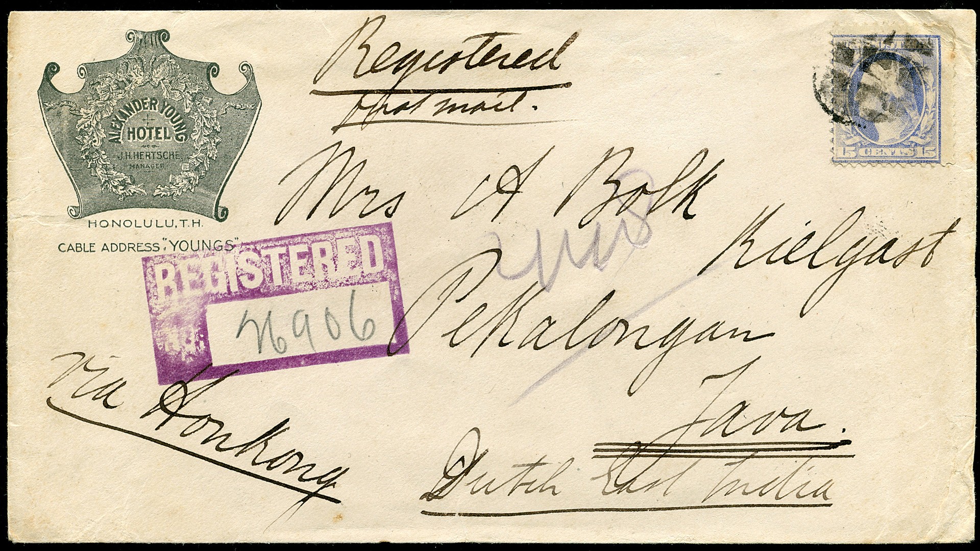 HAWAII. Env. van het Alexander Young Hotel te Honolulu aangetekend op 6-6-1911 over Hong Kong 3-7 naar Pekalongan 15-7