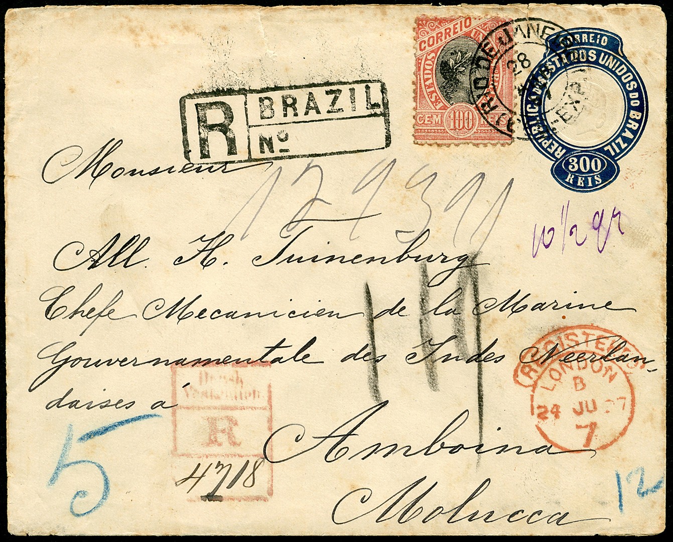 BRAZILIË. Iets smoezelige env. van 300r bijgefr. met 100r aangetekend van Rio 28-4-1897 via St. Thomas 4-6 in Deens West-Indië (rood R-stempel) en Londen 24-6 over Batavia 22-7 en Soerabaja 24-7 naar Amboina. Zeldzaam!