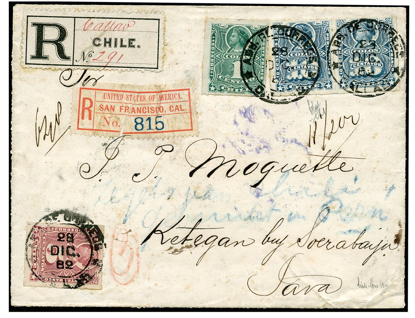 CHILI. Chileense bezetting van Peru tijdens de Pacific War oftewel de Salpeteroorlog (1879-1884). Env. gefr. met 1c, 5c en 10c in paar aangetekend te Callao, een kustplaats van Peru, toen bezet door Chili, op 28-12-1882 via San Francisco 22-1-1883 naar Soerabaja 13-3. Buitengewoon zeldzaam. Cert. 'Peter Holcombe, 1994' CHILE. The Chilean Occupation of Peru during the War of the Pacific, also known as the Salpeter War (1879-1884). Cover bearing 1c, 5c and 10c in pair registered from the city of Callao in occupied Peru on 28 Dec 1882 via San Francisco 22 Jan 1883 to Soerabaja 13 March. Cert. 'Peter Holcombe, 1994: A rare occupation letter to a most unusual destination.'