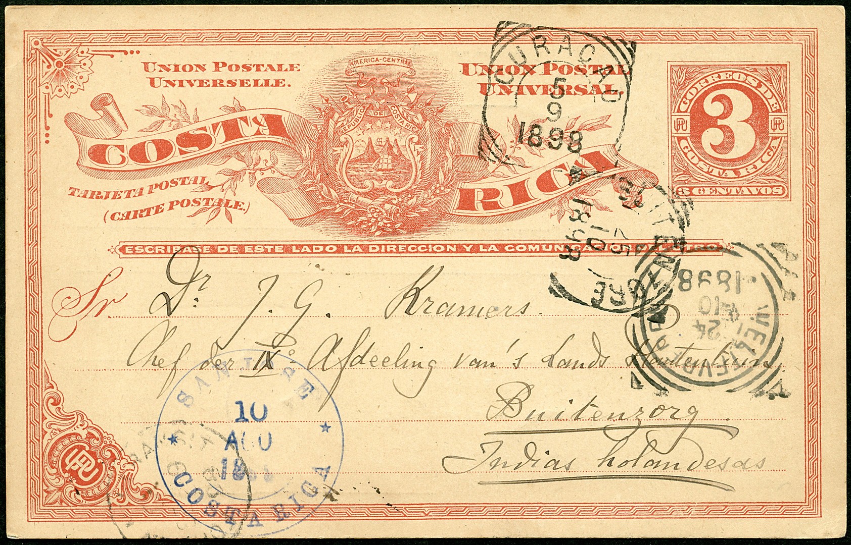 COSTA RICA. Bk. van 3c op az. deels bedrukt door het 'Museo Nacional de Costa Rica', van San Jose 10-8-1898 via Colon (Panama) 25-8 en Curaçao 5-9 over Weltevreden 24-10 naar een geleerde heer van 's Lands Plantentuin te Buitenzorg 25-10