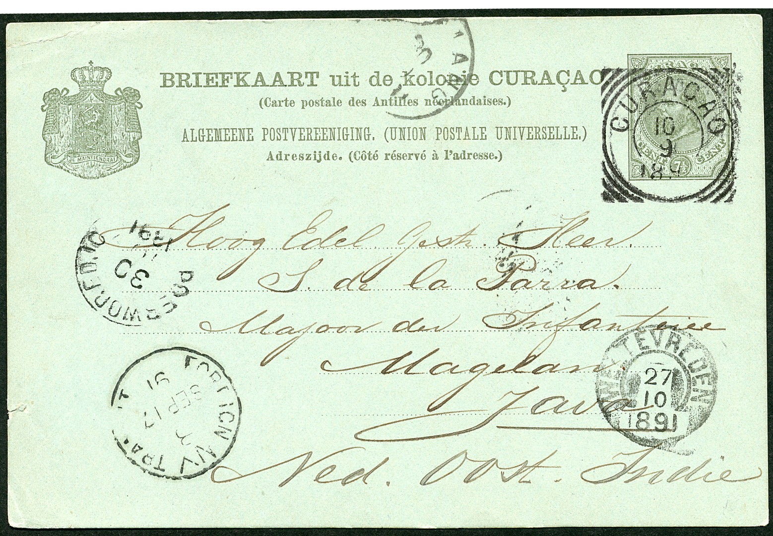 CURAÇAO. Bk. G8 van Curaçao 10-9-1891 via New York 17-9 over Weltevreden 27-10 en Poerworedjo 30-10 naar een majoor te Magelang