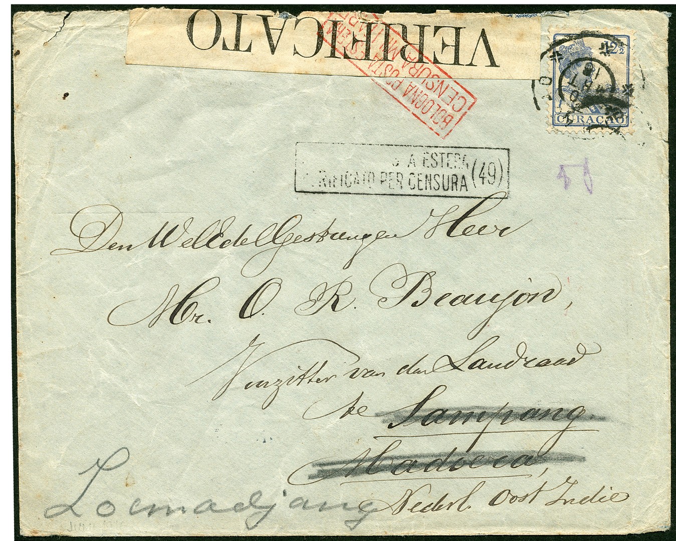 CURAÇAO. Twee env. uit 1916 van een notaris te Curaçao naar diens naamgenoot te Sampang, Madoera, waarvan een met 12½c gefr. env. van 10-3 via Funchal 11-5 is verz. en in Bologna is gecensureerd