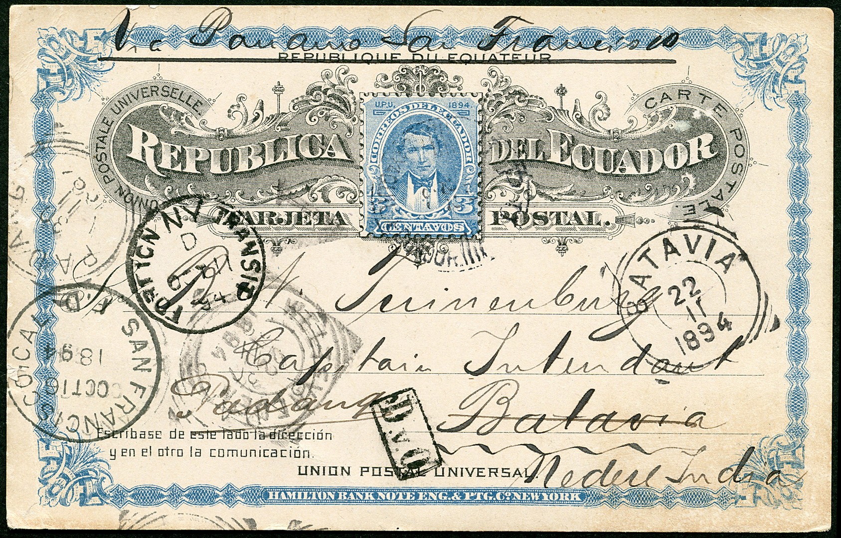 ECUADOR. Bk. van 3c van Guayaquil 20-9-1894 'via Panama', New York 11-11, San Francisco 16-10 over Weltevreden 22-11 en Batavia 22-11, via het D.v.O. doorgez. naar Padang 30-11