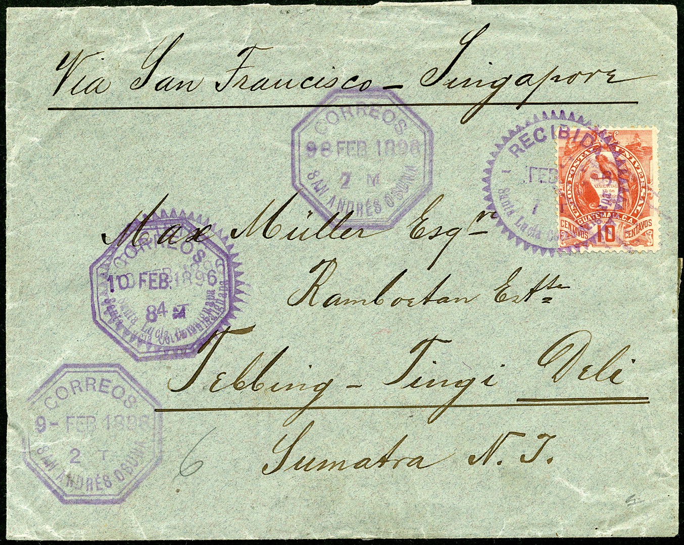 GUATEMALA. Env. gefr. met 10c van Santa Lucia Cotzumalguapa 1-2-1898 via San Andrés Osuna 8-2 en 9-2 'Via San Francisco - Singapore' over San Fransisco 3-3, Singapore 6-4, de N.I.Agent Singapore 6-4 en Medan 8-4 naar Tebingtinggi Deli 9-4. Bijzonder poststuk!
