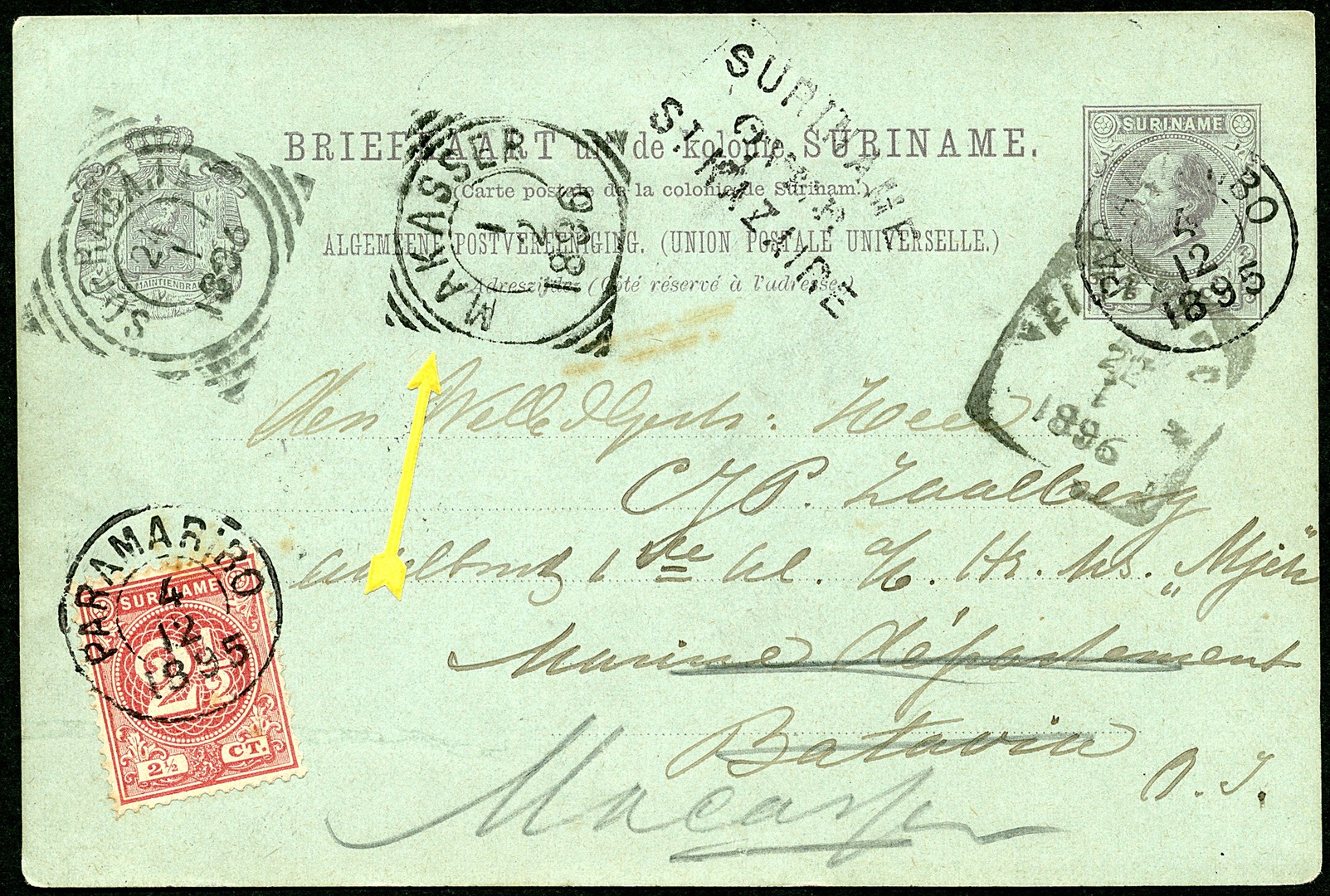 SURINAME. Bk. G9 bijgefr. met 2½c van Paramaribo 4-12-1895 'over St. Nazaire' via naar het Departement van Marine te Weltevreden 22-1-1896 waar de kaart via Soerabaja werd doorgez. naar de 'Atjeh' te Makasser 1-2