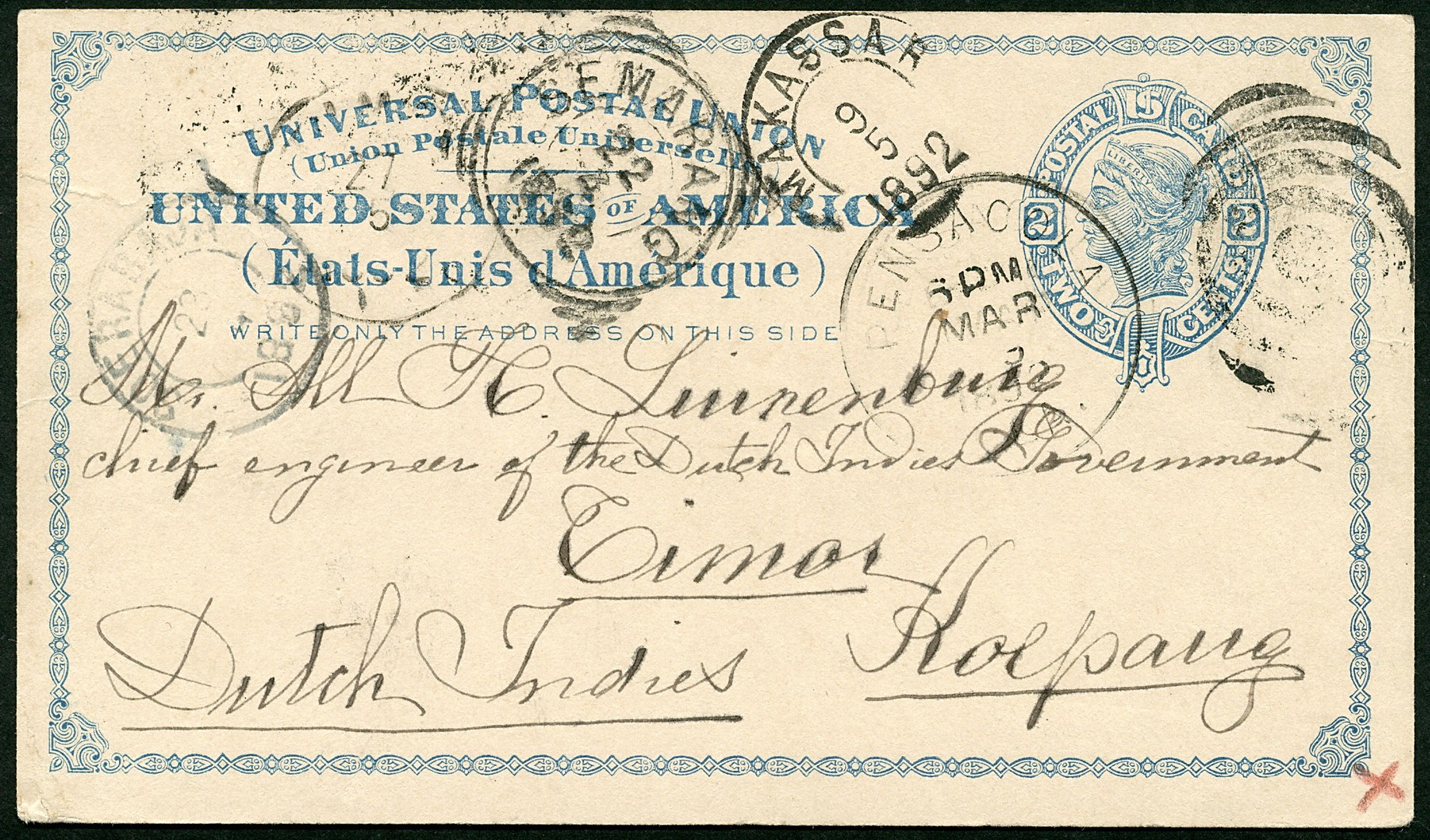 USA. Bk. van 2c van Pensacola 9-3-1892 over Semarang 22-4, Soerabaja 23-4 en Makassar 9-5 naar Koepang op Timor 27-5. Aardige bestemming!