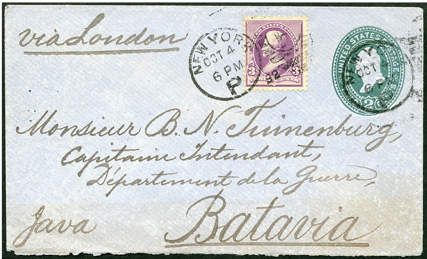 USA. Acht poststukken 1892-1919 w.o. twee in Indië beport