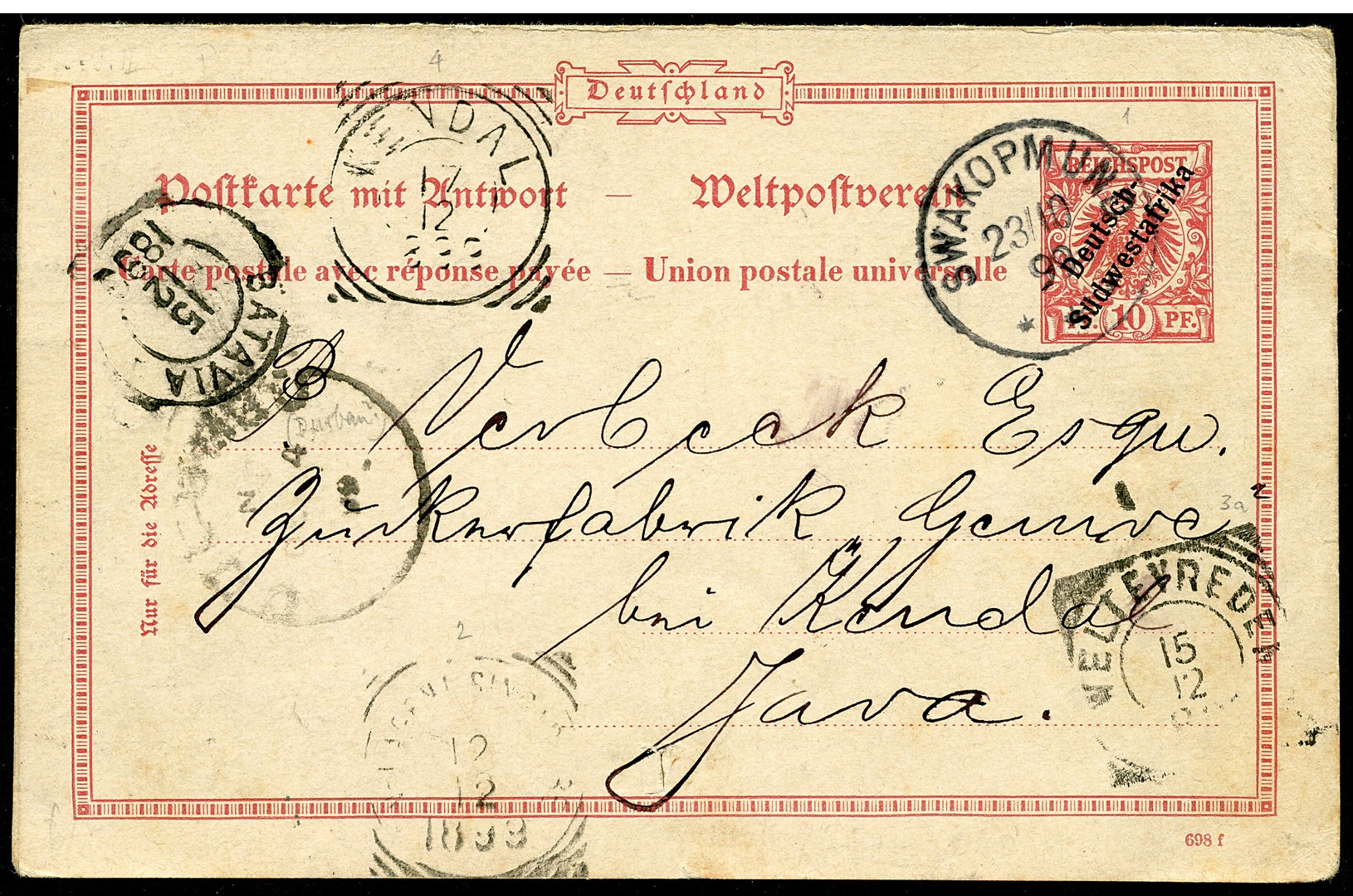 DUITS-ZUIDWEST-AFRIKA. Dubbele bk. van 10pf, beide kaarten gebruikt, van Swakopmund 23-10-1899 over Colombo 4-12, de N.I.Agent Singapore 12-12, Weltevreden 15-12 en Batavia 15-12 naar Kendal 17-12, de A-kaart via Durban (Natal) weer naar Swakopmund 4-4-1900