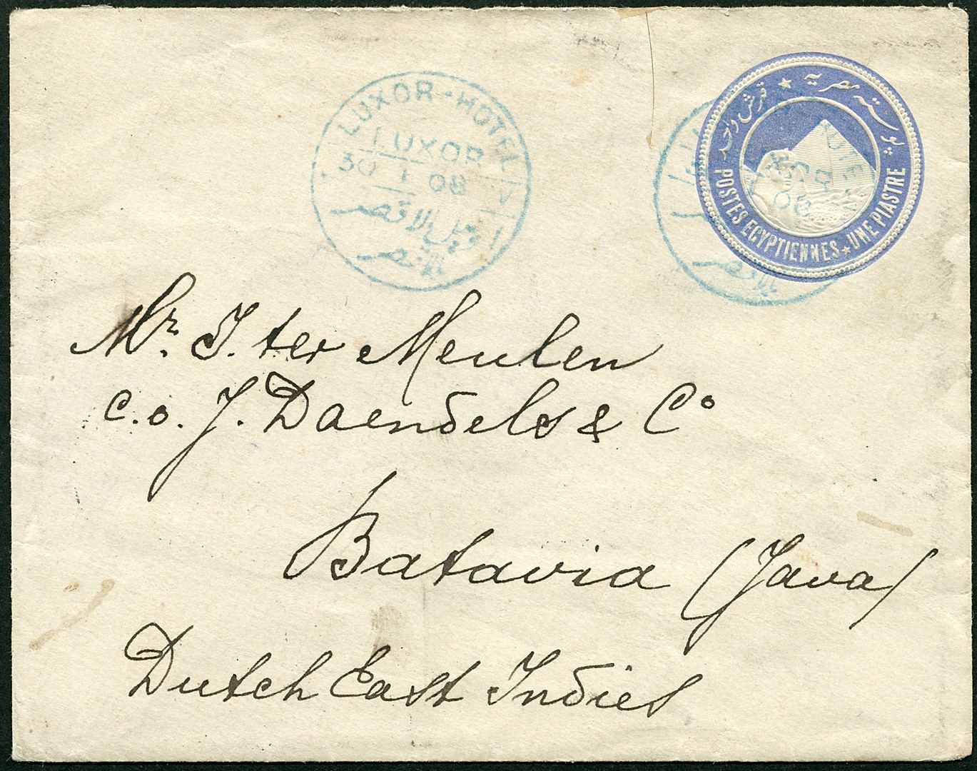 EGYPTE. Hotelpost. Env. van 1p (boven knipje) in blauw afgest. LUXOR-HOTEL te Luxor 30-1-1908 o.a. over Suez 31-1 naar Weltevreden 22-2, prentbk. gefr. met 4m afgest. SHEPHEARDS-HOTEL te Cairo 5-7-1910 over Cairo 5-7 en Port-Taufiq 6-7 naar Batavia, alsmede twee prentbk.