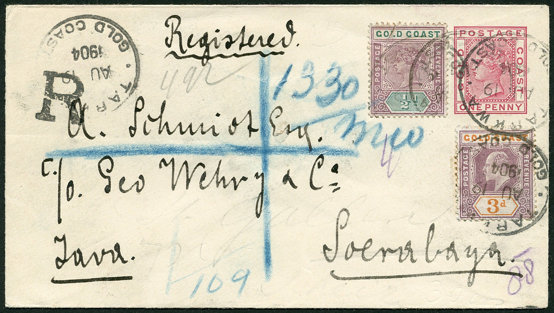MAURITIUS. Bk. van 6c op 10-8-1891 met de Franse pakketboot no. 1 van de Ligne T 15-8 naar Aden 20-8, vandaar via de N.I.Agent Singapore 8-9 naar Soerabaja 13-9. Prachtkaart!
