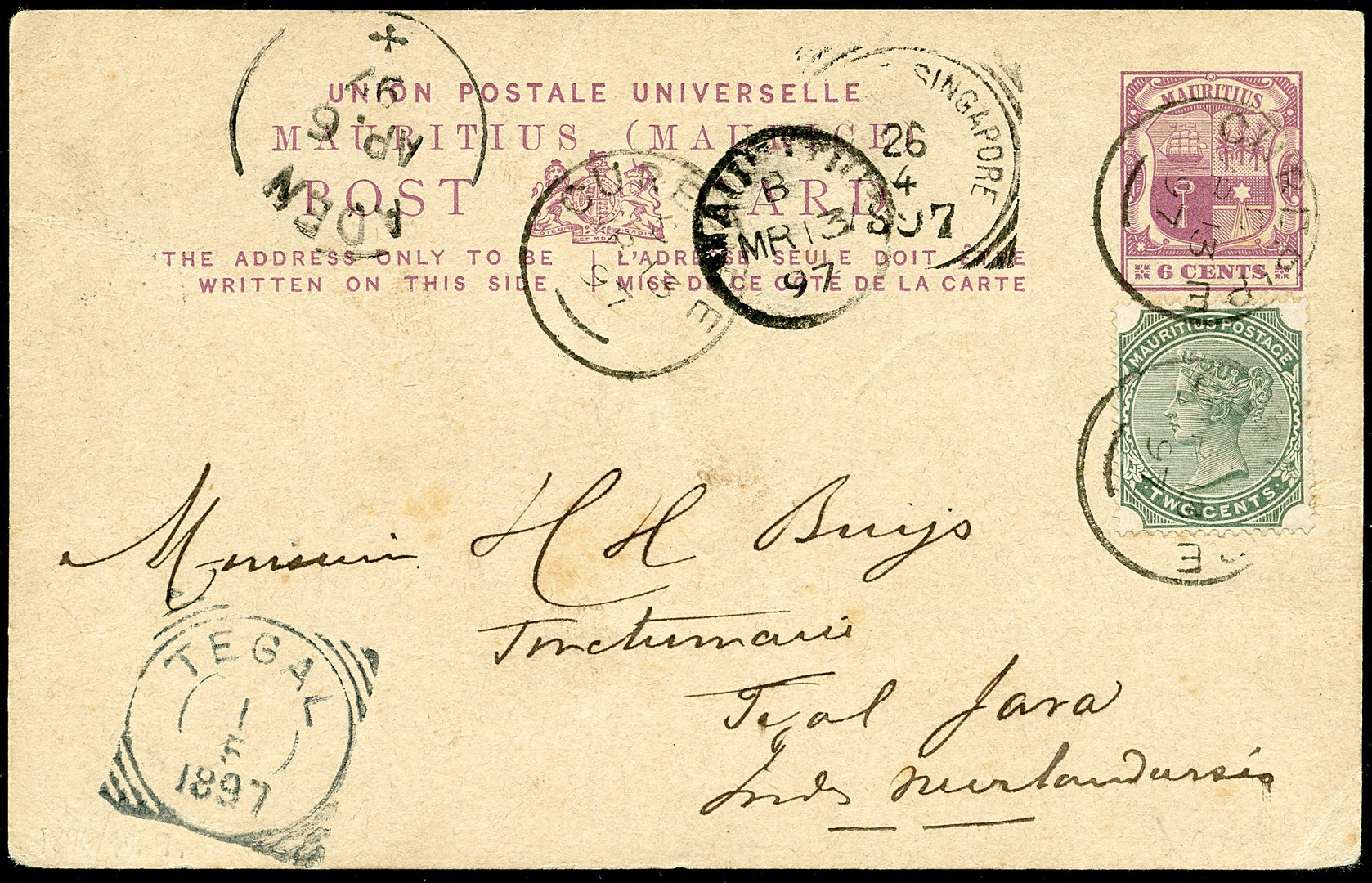 MAURITIUS. Bk. van 6c bijgefr. met 2c van Curepipe 13-3-1897 via het hoofdpostkantoor Mauritius 13-3 met de Franse pakketboot van La Reunion à Marseille 13-3 (az.) naar Aden 6-4, vandaar via de N.I.Agent Singapore 26-4 naar Tegal 1-5. Mooie kaart!