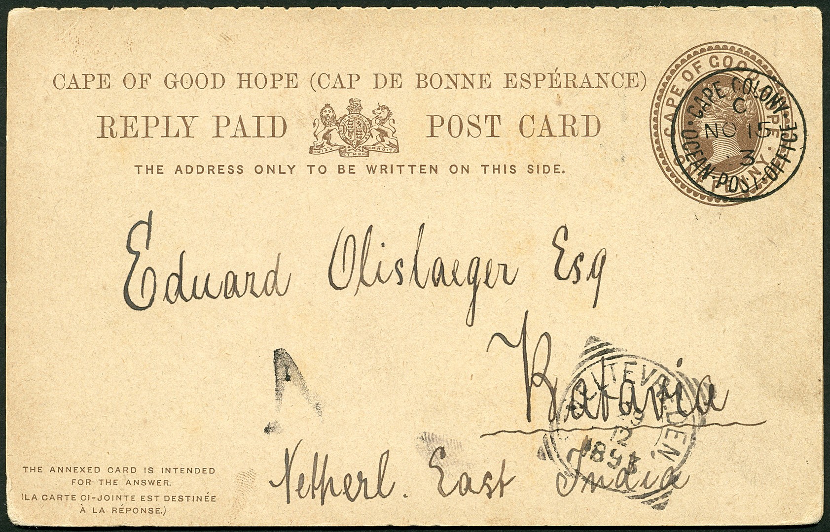 ZUID-AFRIKA. KAAP DE GOEDE HOOP. Dubbele bk. van 1d (A-kaart onbeschreven) afgest. Ocean Post Office / Cape Colony 15-11-1893 naar Weltevreden 29-12 en te Batavia in de avond besteld (A)