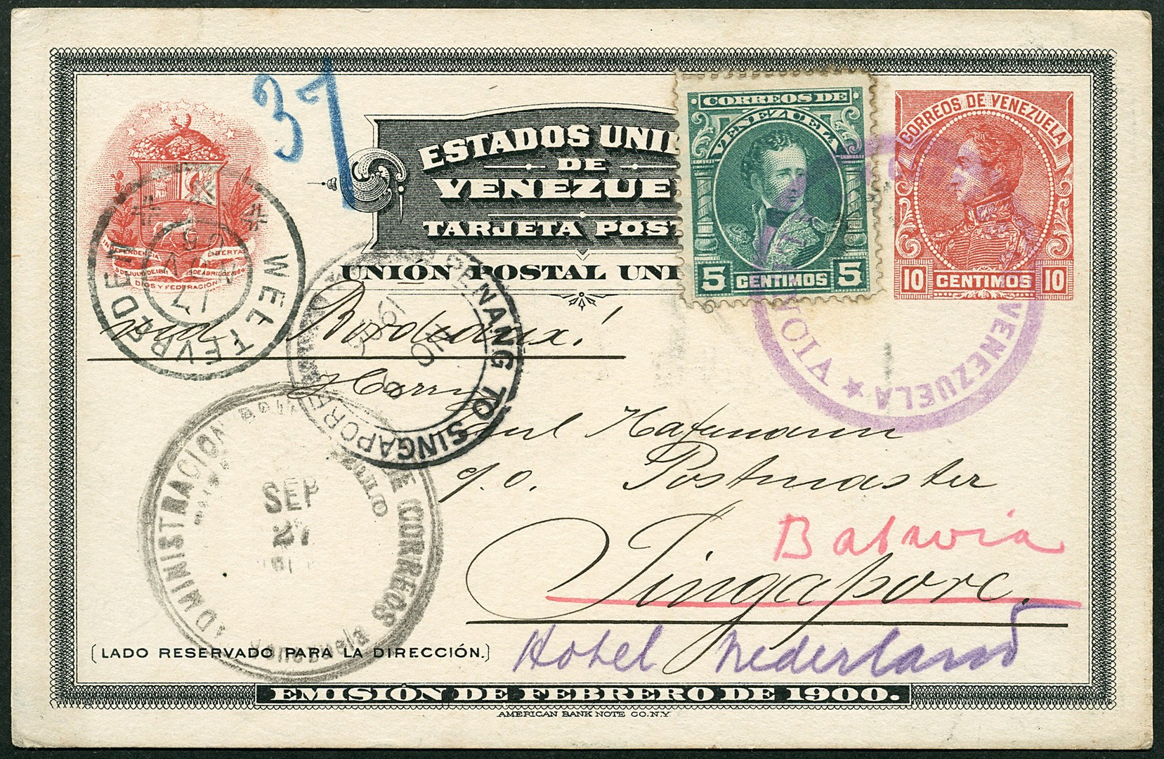 SCHEEPSPOST. PENANG TO SINGAPORE. VENEZUELA. Bk. van 10c bijgefr. met 5c van Valencia 25-9-1906 via Penang to Singapore 9-11 (op vz. en az.) van Singapore doorgez. via Weltevreden 17-11 naar een hotel te Batavia