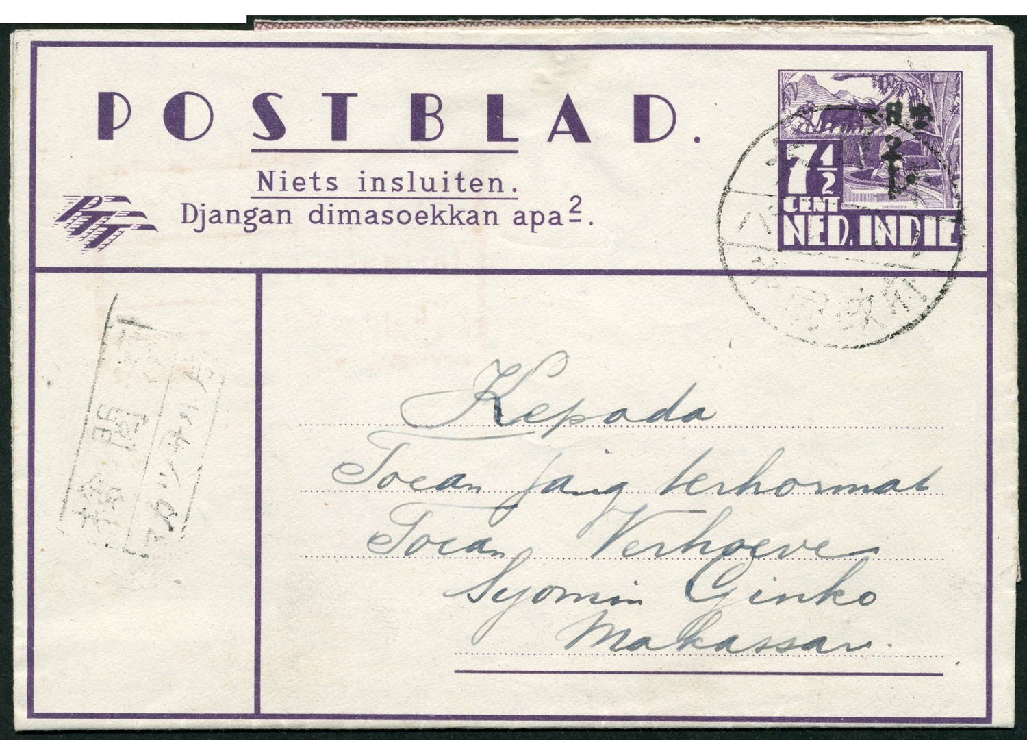 CELEBES. 7½ Cent letter sheet with anchor overprint Bu.239a (on the back staple removed) written at Pare Pare 6-7-’03 and cancelled type 300, sent to Makasser. Censor Vr.212a. A rare postal item!