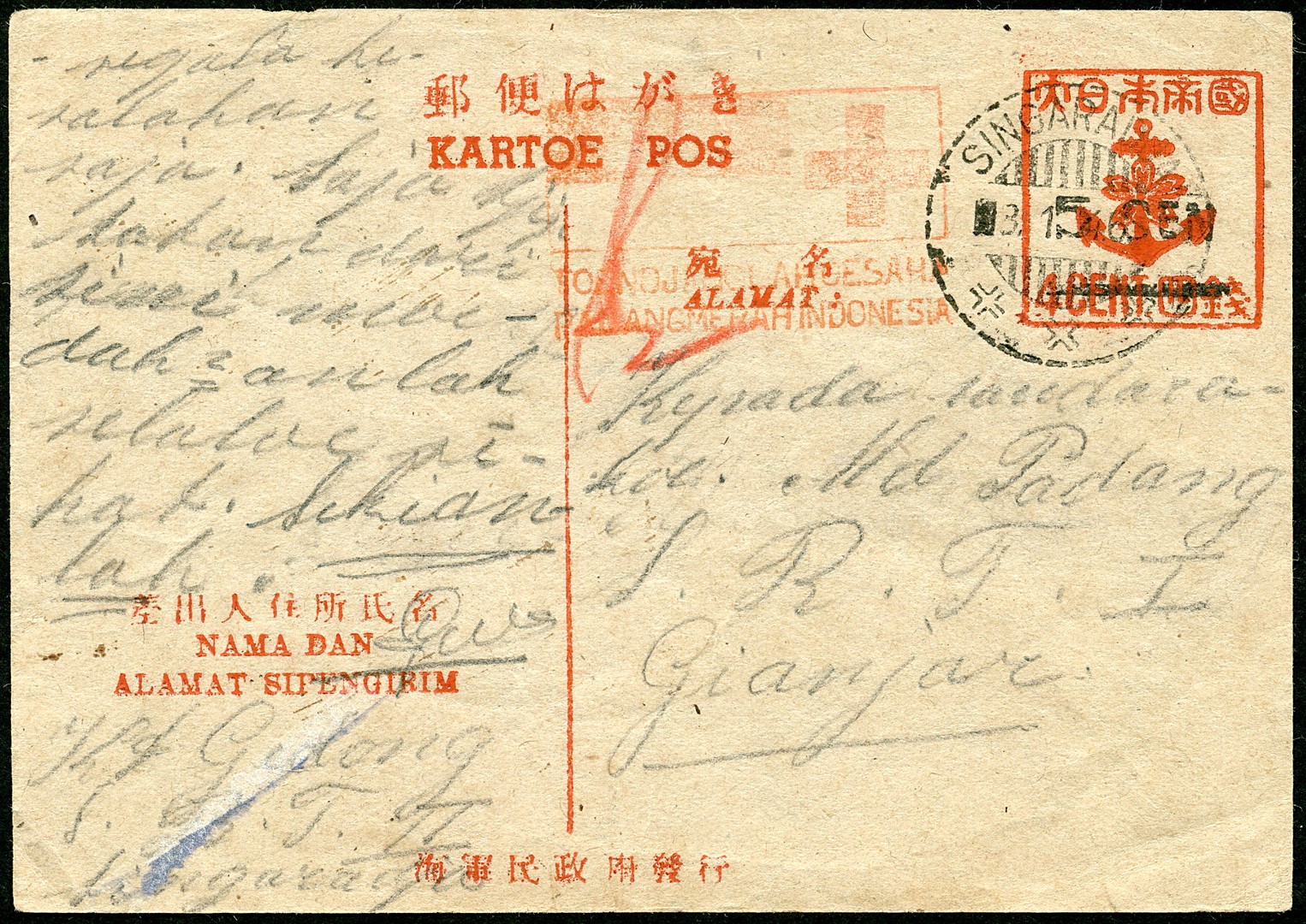 LESSER SOENDA ISLANDS. BALI. Anchor and cherry blossom postcard of 4 cent revalued and overprinted with 5 sen Bu.274 from Singaradja 8.1.4.6 to Gianjar. This card is known used in January 1946 on Bali, this copy being the earliest recorded, thus after the Japanese occupation. It must have been Republican usage. In the middle an Indonesian Red Cross cachet is applied ‘Toendjanglah Oesaha / Palang Merah Indonesia’ (Support the effort of the Indonesian Red Cross). Reference: JR van Nieuwkerk, ‘The Postal History of the Lesser Sunda Islands…’ An intriguing postal item with great historical significance
