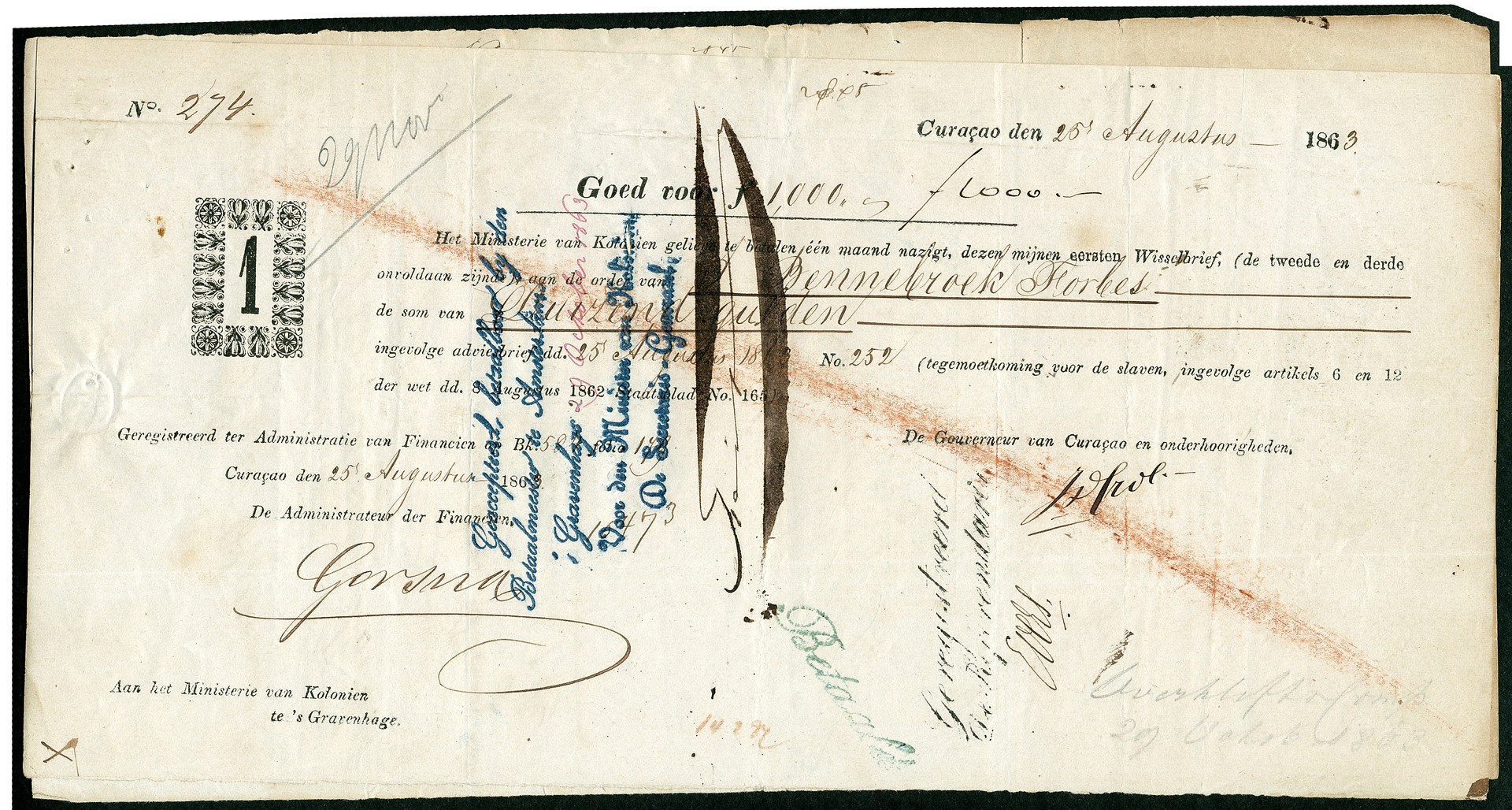 Wisselbrieven, 1e nr. 274 en 2e nr. 274 bij elkaar horend, voor het vergoeden van vrijgelaten slaven, uitgeschreven op 25-8-1863 te Curaçao, ondertekend door de Gouverneur van Curaçao J.D. Crol. Geldbedragen ƒ 1000 voldaan op 1-2-1863. Op beide az. een fiscaalzegel van 50c. Zeldzame, historische documenten!