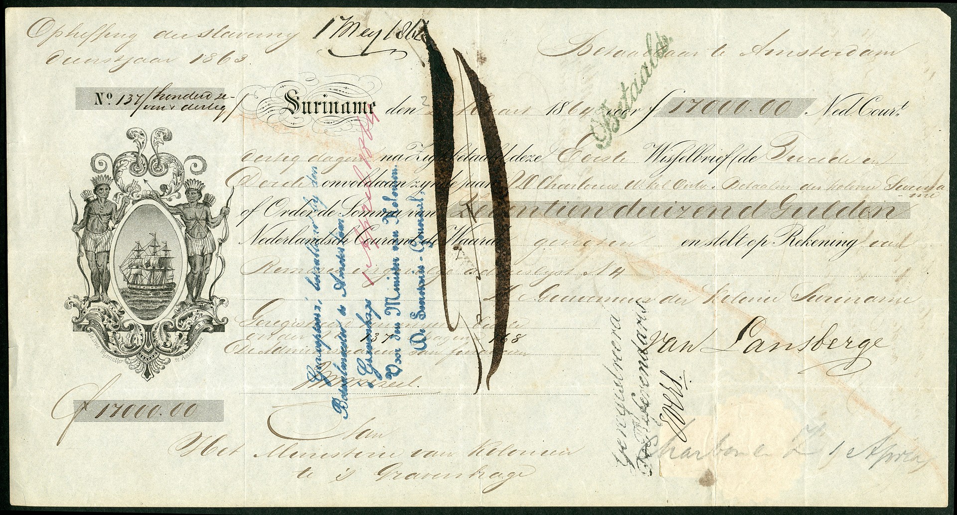 Wisselbrief voor het vergoeden van vrijgelaten slaven. De slavernij werd op 1 juli 1863 in Suriname afgeschaft en de slavenhouder werd daarvoor financieel schadeloos gesteld door de Nederlandse Staat. Deze wisselbrief nr. 137 is uitgeschreven op 2-3-1864, ondertekend door de Gouverneur der Kolonie Suriname R.F. van Lansberge, geldbedrag fl. 17.000, uitgekeerd op 2-5-1864 aan toonder. Prachtig bewaard gebleven historisch document met notities, stempels en op de achterzijde een fiscaalzegel van 8,50
