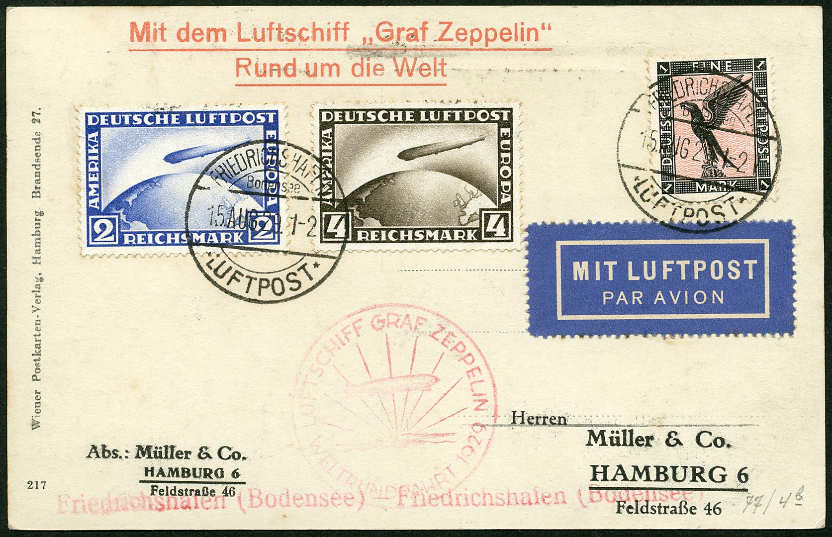 Zeppelinpost. Duitsland. Vlucht rondom de wereld 7 aug. - 4 sep. 1929. Briefkaart met o.a. 2RM en 4RM (vrijwel prachtex.) op prentbk. van Friedrichshafen 15-8-1929 weer naar Friedrichshafen. S.30Ad. € 500+