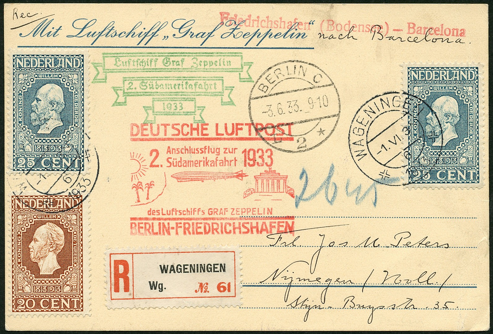 Zeppelinpost. Nederland. 2e Vaart naar Zuid-Amerika 3-6-1933, met aanbrengvlucht Berlijn-Friedrichshafen, afworp Barcelona. Mooi gefr. R-bk. VH.I.73a+d. € 400