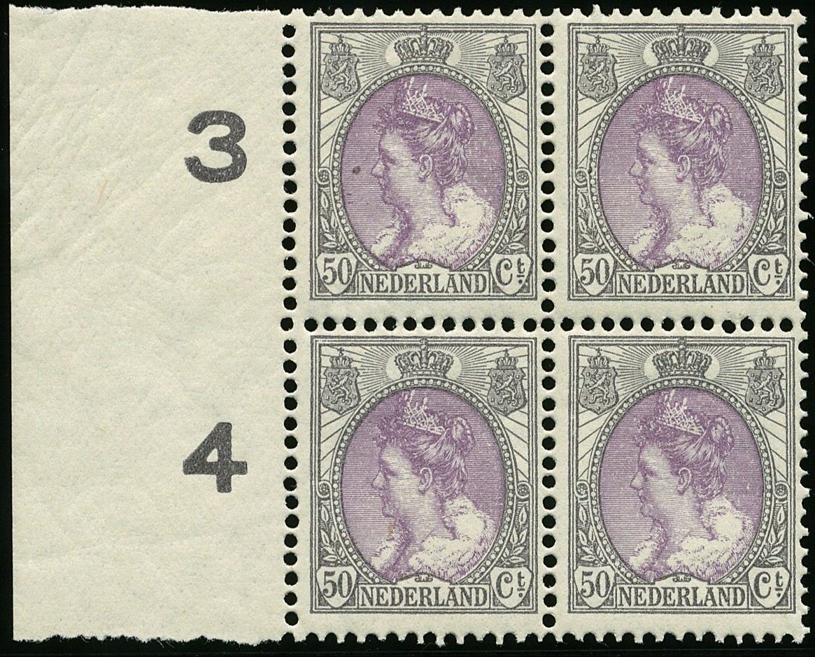70, 22½ cent bruin en olijfgroen en 75, 50 cent grijs en violet, beide in luxe postfrisse randblokken € 1120