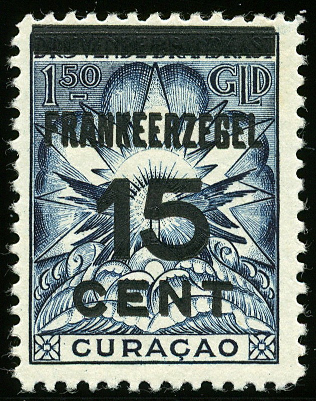 85f, 15 ct. op 1½ Gulden met dubbele opdruk, ongebruikt prachtex. met lichte plakkerrest en cert. NVPH (1984). Zeldzaam zegel € 2000