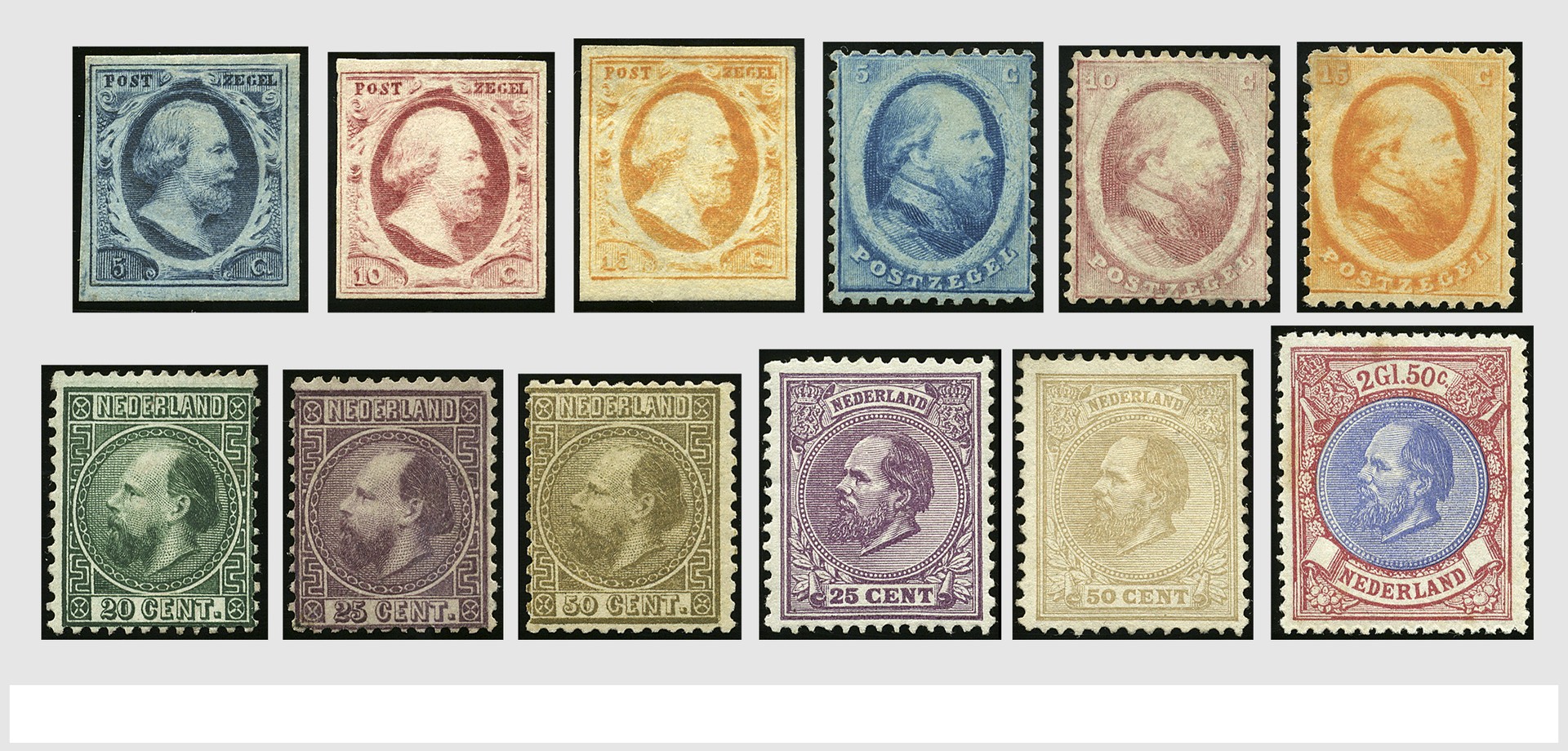 1852-1888, nrs. 1 t/m 29 compleet ongebruikt op Schaubek albumbladen. De nrs. 1/3 nagegomd, 4/6 zware plakkerrest, 7 *, 8 en 9 (*), 10, 11 en 12 met valse gom, 13 *, 14 valse gom, 15/18 *, 19/28 * en 29 postfris met cert. C. Muis: "postfris met originele gom. De gom is roestig". Hoge cat.wrd.!
