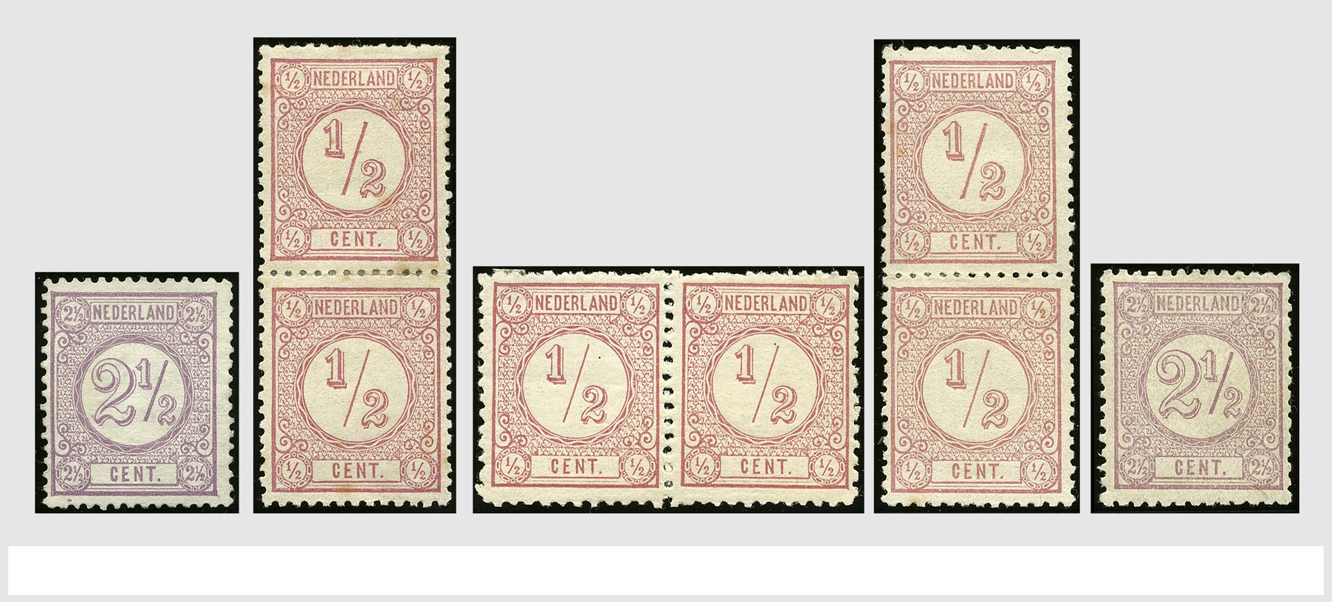 Emissie 1876-1894, Cijfer, op tanding en kleuren gespecialiseerde verzameling waarbij gecombineerde tandingen o.a. 33D + 33C, Specimen-opdrukken en 2 zeer fraaie verticale paren 30EI + II