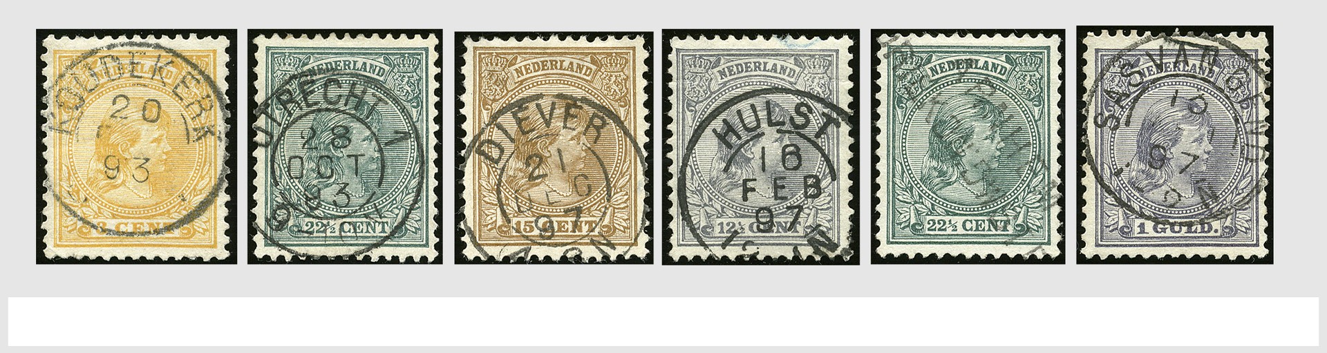 1891-1896, emissie Hangend Haar (excl. nr. 48) gespecialiseerd op oplagen 1e, 2e en 3e groep, kleurschakeringen, papier, enkele proeven, stempels, perfins, blokken en strippen, alsmede ongebruikte postwaardestukken incl. banderol. Heeft gediend als studie- en illustratiemateriaal voor behandeling in HPN