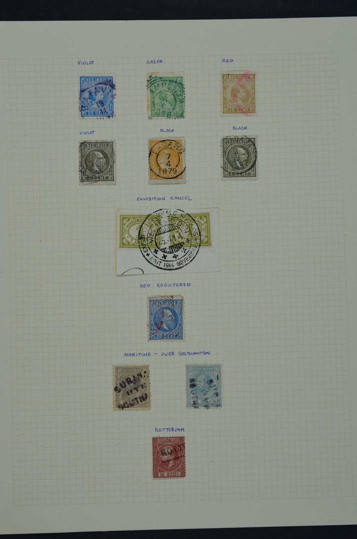 NED.- INDIË POSTHISTORIE, diverse stempeltypen zoals punt-, naam-, kleinrond-, korte- en langebalk op losse zegels (vooroorlogs) op bladen, alsmede enkele poststukken w.o. met naamstempels