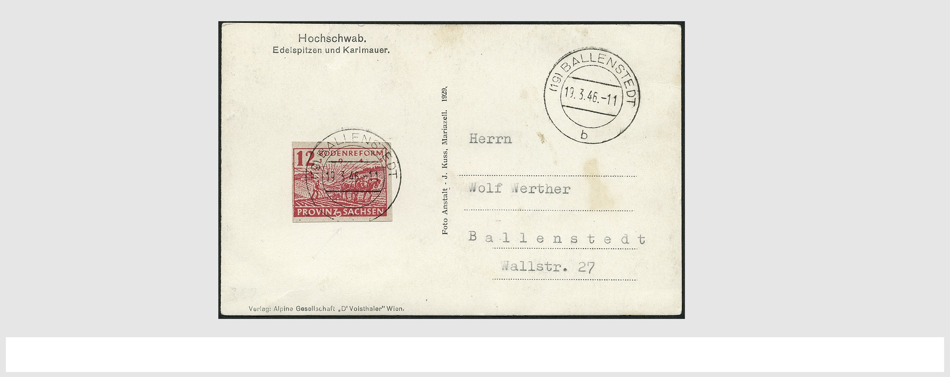 SBZ-SACHSEN Mi.86II, 12 Pf. donkerrood met plaatfout 'Herz bei "Z" von Provinz', gebruikt prachtex. op prentbriefkaart van Ballenstedt 19.3.46 € 700