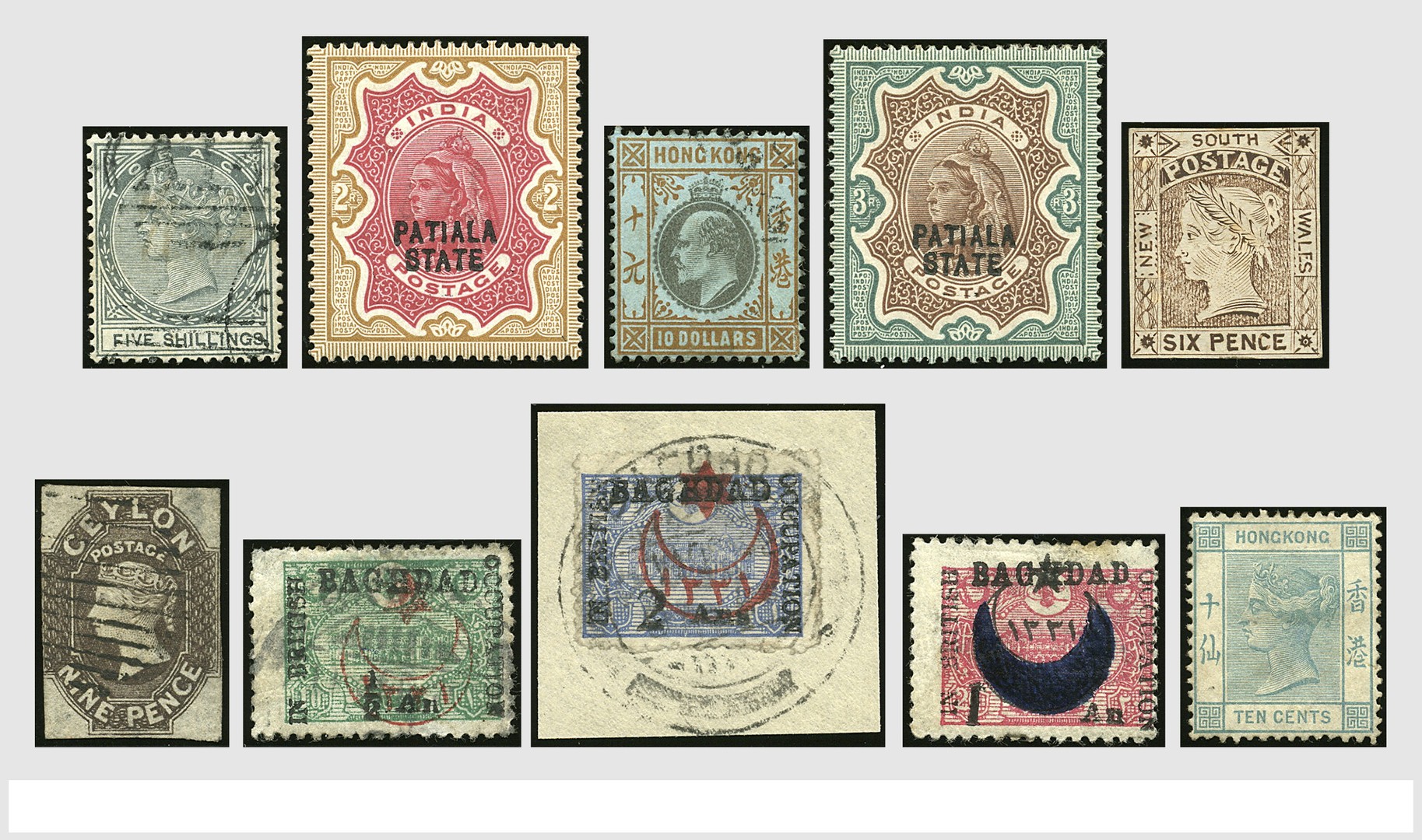 ENGELSE KOLONIËN, mooi kavel met betere postzegels van Patiala State S.G. 29/31, Hong Kong S.G. 37 * en 76, New Foundland S.G. 20/23, Tobago S.G. 2, 3, 5, Britich Guyana S.G. O.4/5, etc.